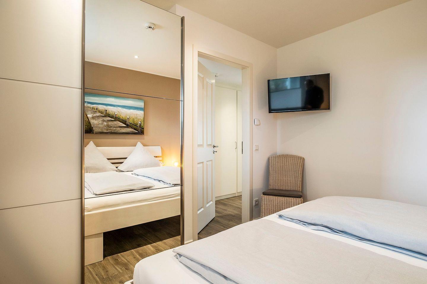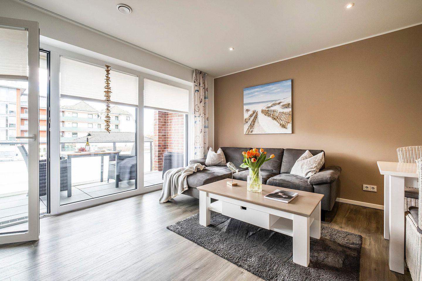 Entern Sie Ihre Kabine und stellen Sie Ihr Gepäck zunächst einfach beiseite, um vom Wohnzimmer oder südwestlichen Balkon aus den herrlichen Deichblick und die frische Brise zu genießen.