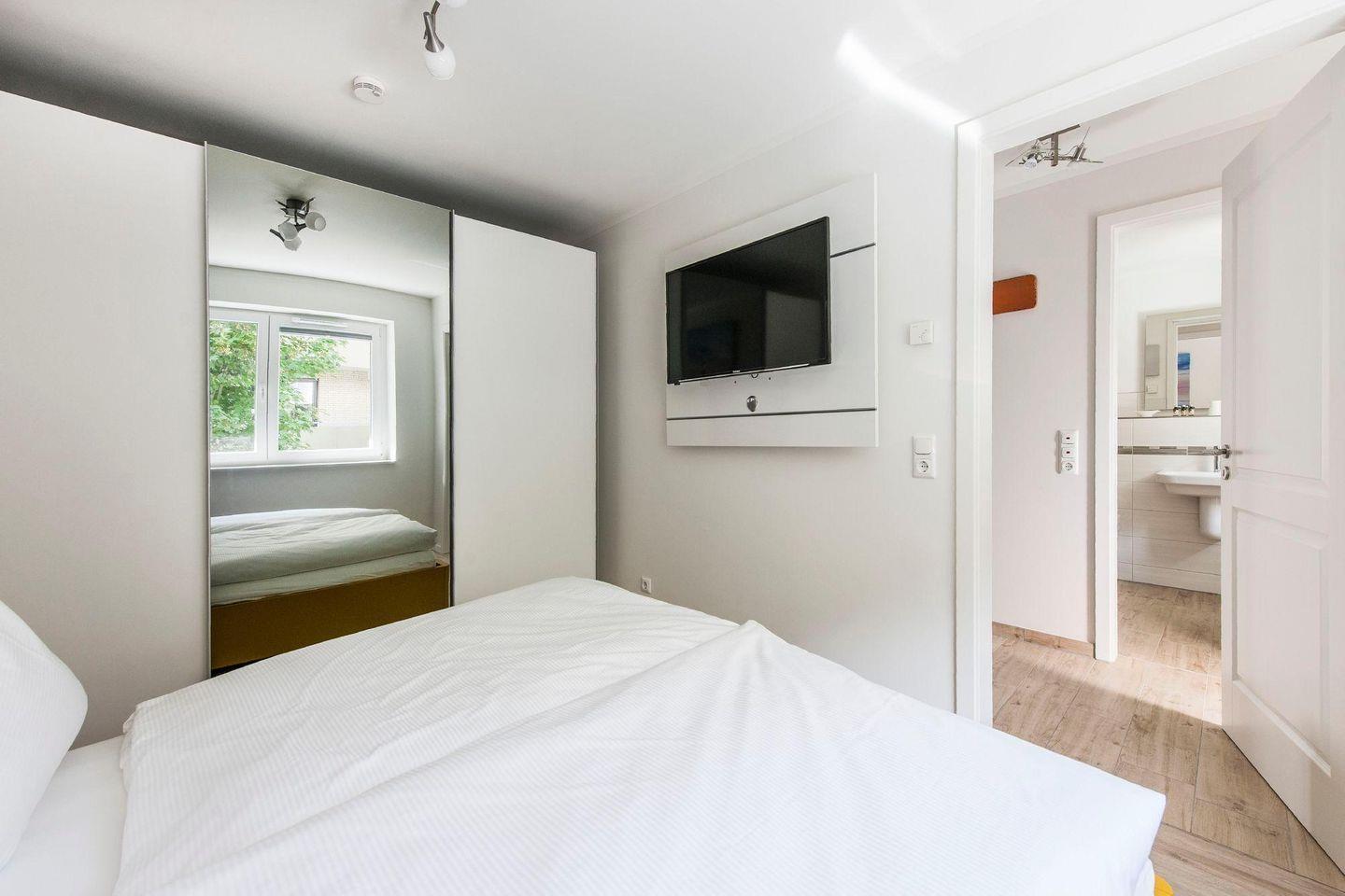 Das Schlafzimmer ist mit einem Doppelbett und einem Wand-Montage-Fernseher ausgestattet.