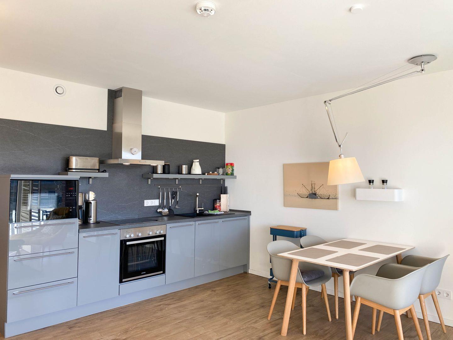 Küche: Backofen, Cerankochfeld, Mikrowelle, Geschirrspüler, Kühl- Gefrierkombination, Kaffeemaschine, Wasserkocher, Toaster
