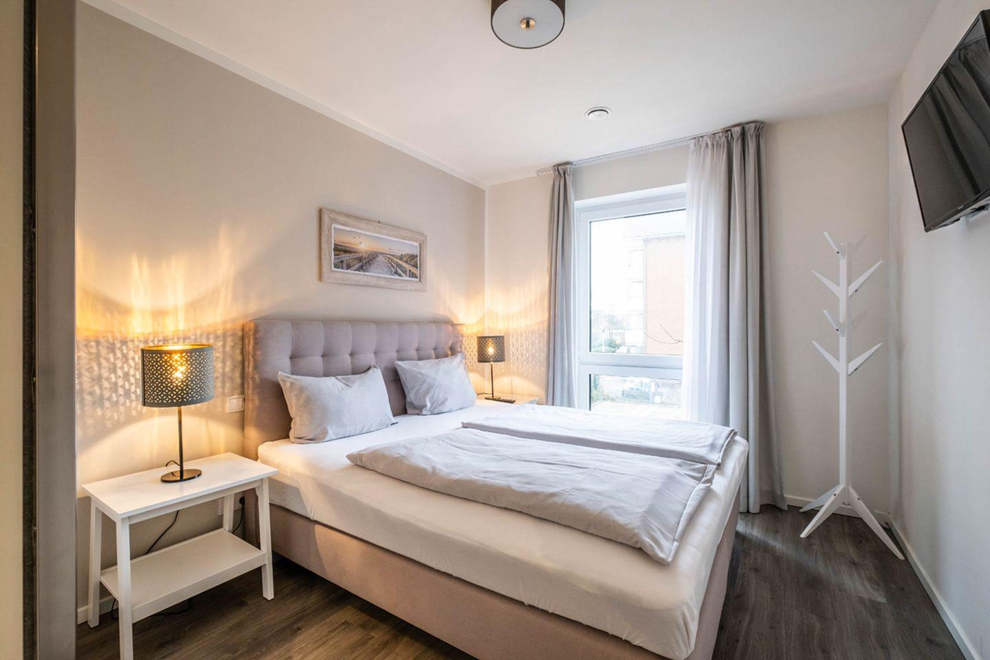 Das Appartement 1.1 befindet sich im I. Obergeschoss und hat einen Balkon mit Strandkorb. Die Wohnung verfügt über 2 Schlafzimmer mit je einem Doppelboxspringbett und einem Fernseher.