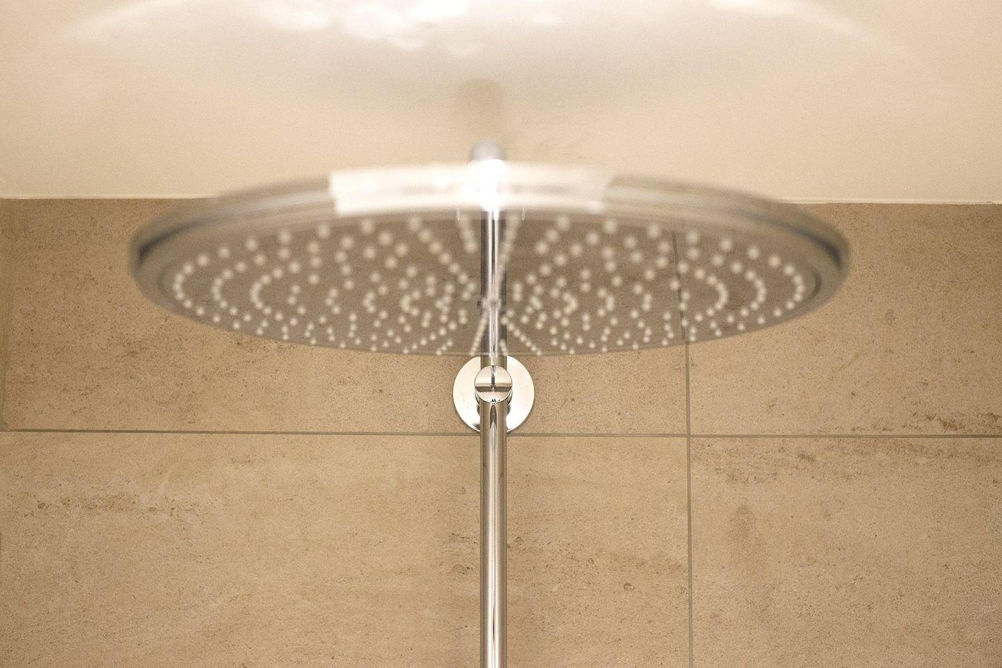Das Wohlfühlen setzt sich im Badezimmer gleich fort, denn die bodenebene, barrierefreie Dusche wird durch eine XL-Rainshower von Grohe in ein kleines Spa verwandelt.