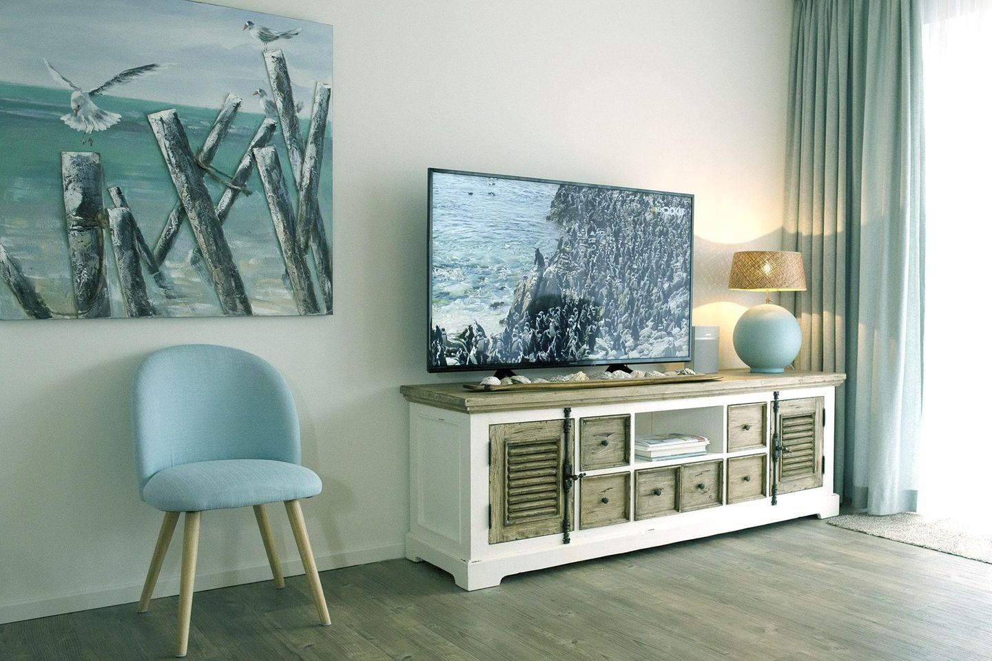 Dieser lässt sich auch vom lichtdurchfluteten Wohnzimmer aus betrachten, dem Herz des Möövnests. Hier laden der kuschelige XL-Lounge-Sessel und das komfortable 3er-Sofa ein, sich herrlich einzunisten und auf dem beeindruckend großen Flachbildschirm entspannt einen Serienmarathon einzulegen.