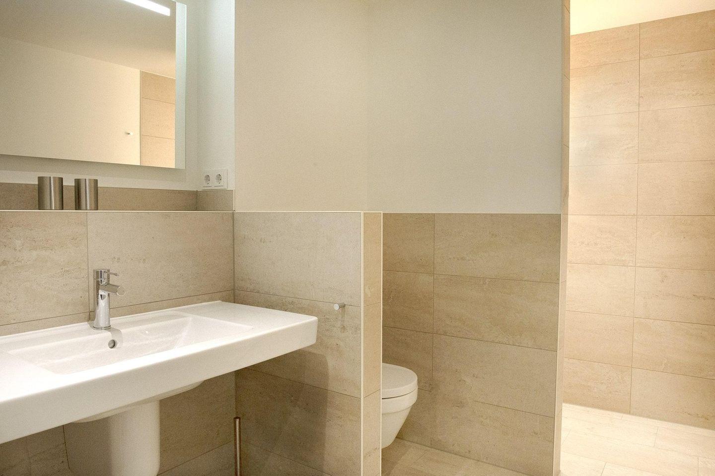 Badezimmer: Duschbad mit Regendusche und ebenerdiger Einstieg, Handtuchheizung, Haar-Föhn, Kosmetikspiegel