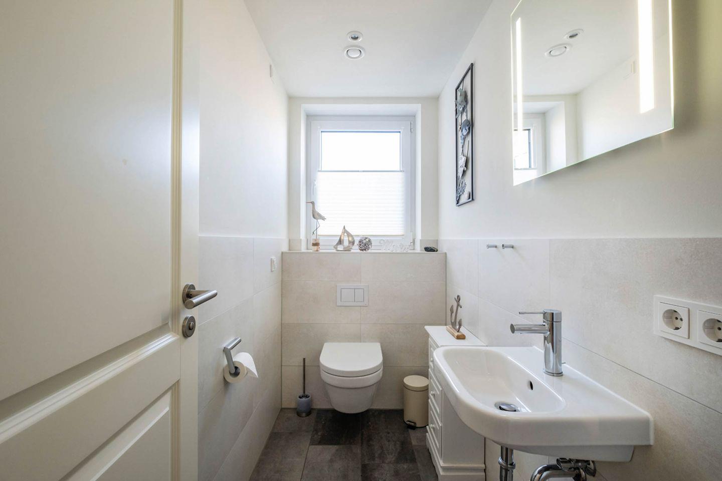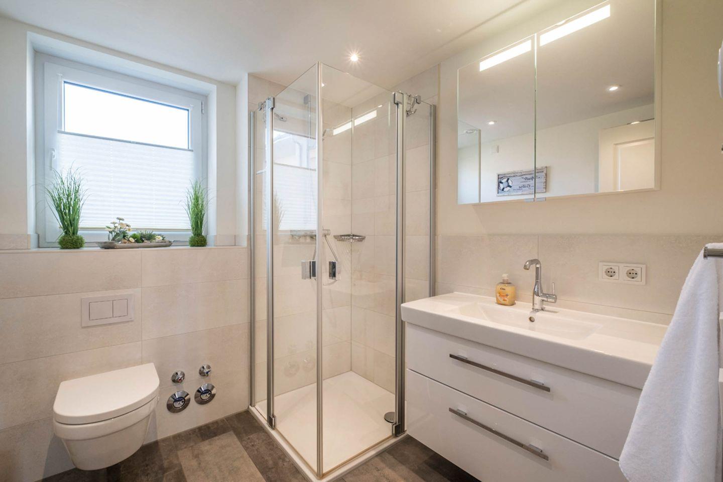 Sanitär: 1 Duschbad mit Handtuchheizung, Haar-Föhn, Kosmetikspiegel und ein zusätzliches Gäste-WC vorhanden