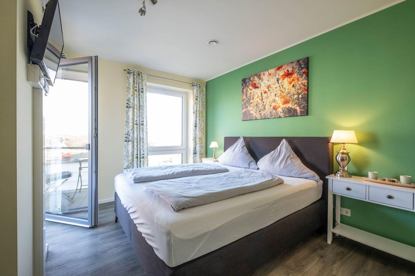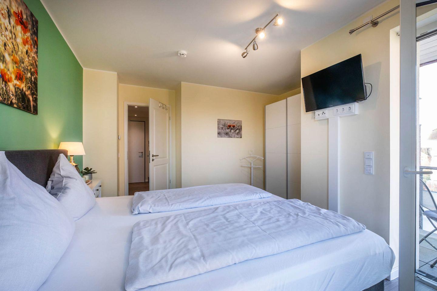Das Appartement 3.7 befindet sich im III. Obergeschoss im seitlichen Teil des Gebäudes und hat zwei Balkone, einen beim Wohnzimmer, den anderen bei einem der Schlafzimmer. Die Wohnung hat 2 großzügige Schlafzimmer mit je einem Doppelboxspringbett und einem Fernseher. Durch die großen Fenster im Wohnzimmer ist die Wohnung sehr hell und freundlich. Dem Appartement ist ein PKW- Stellplatz direkt am Haus zugehörig. Fahrradraum, abschließbar.