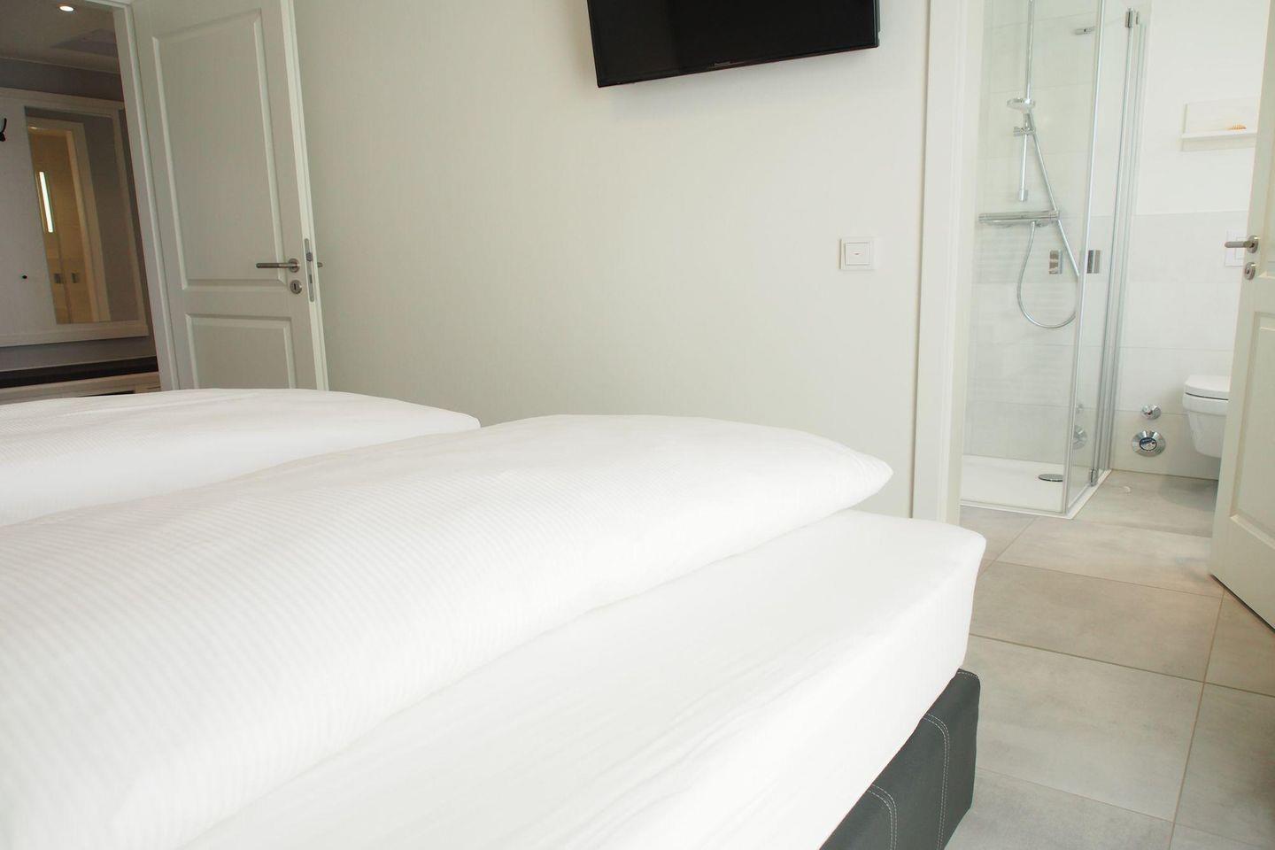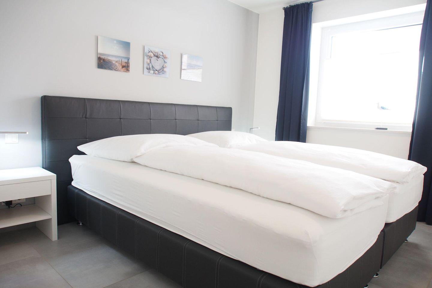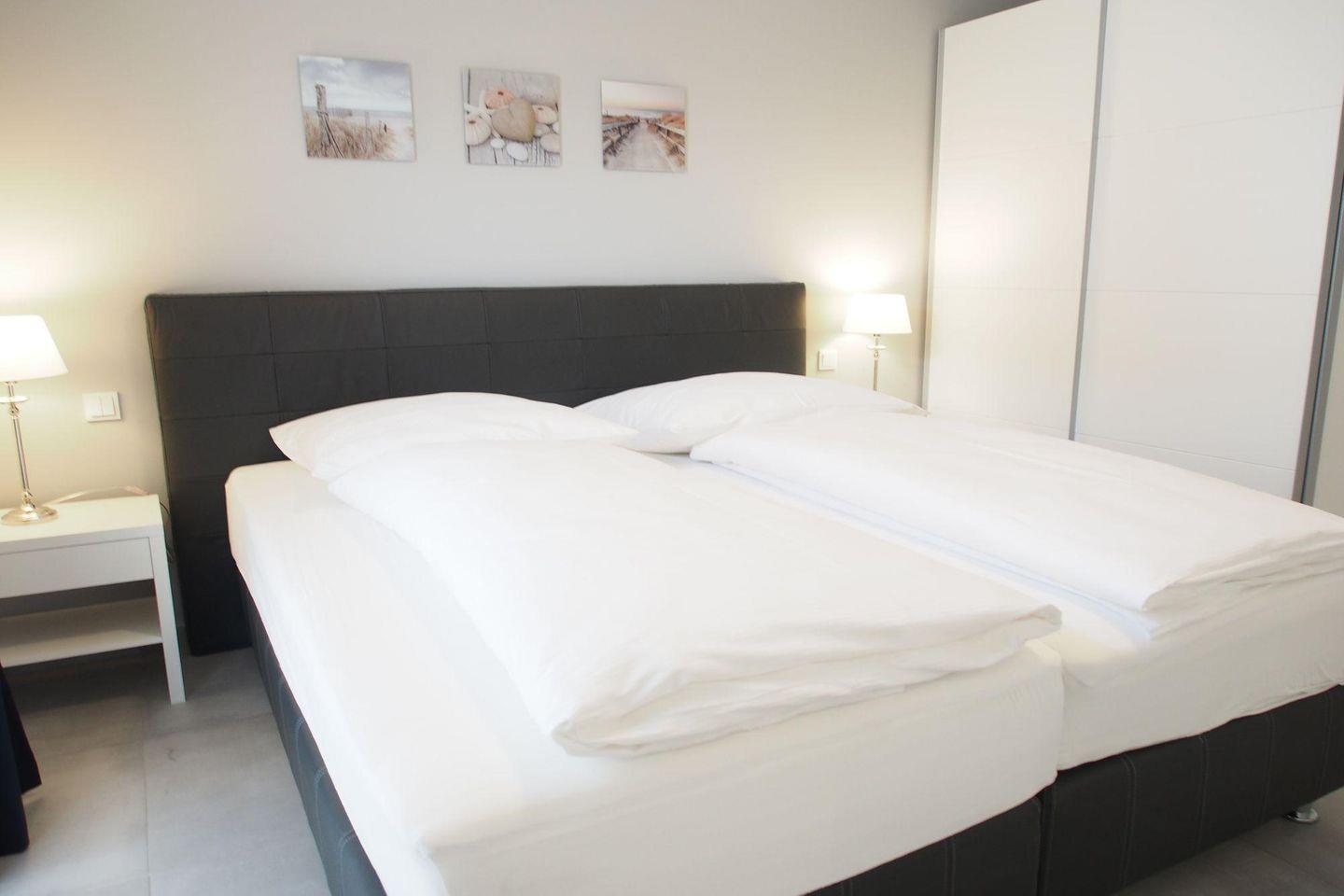 Die Schlafzimmer sind jeweils mit einem hochwertigen Boxspringbett in einer Komforthöhe von 65 cm (2 getrennte Matratzen je 90x200 cm und getrennte Topper 90x200 cm) ausgestattet. Außerdem beinhaltet die Einrichtung einen 2-türigen Schwebetürenschrank, 2 Nachtschränke, 2 Leselampen und 1 Herrendiener sowie jeweils ein TV-Gerät mit Flachbildschirm. Die TV-Wandgeräte haben eine Bildschirmdiagonale von 80 cm und sind damit für den Schlafbereich sehr komfortabel.