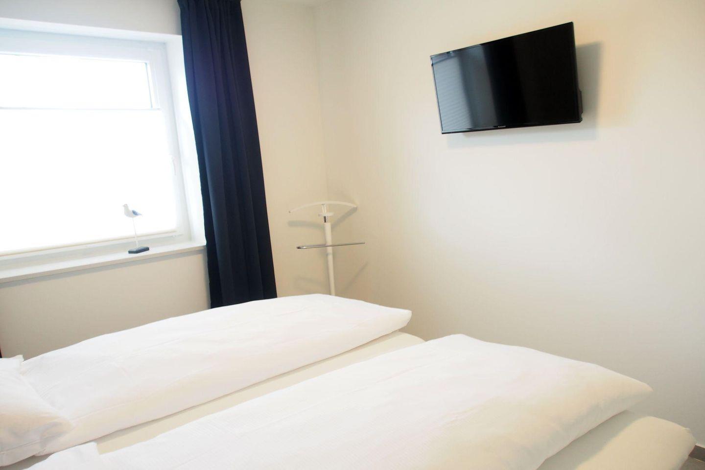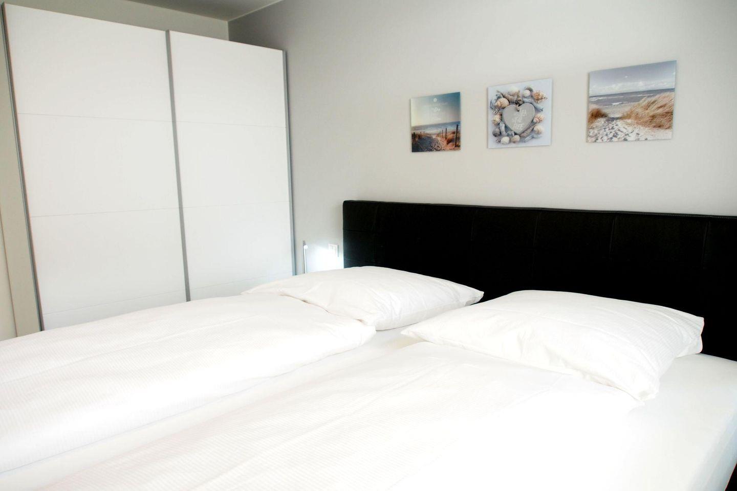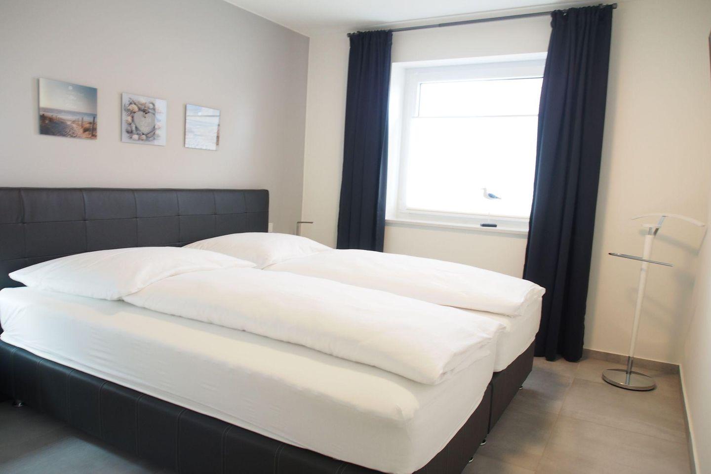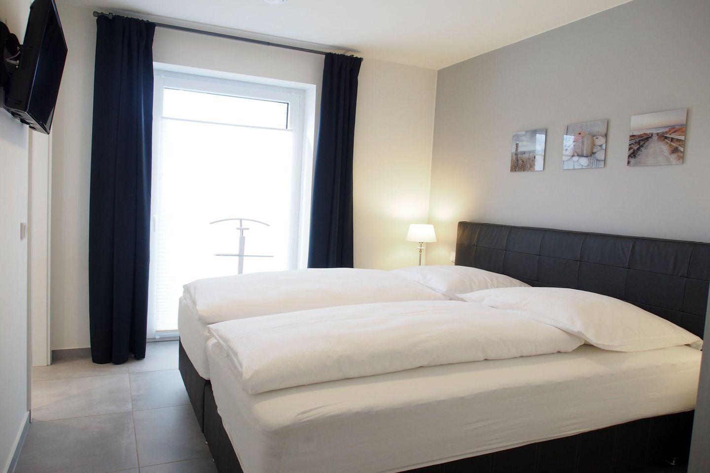 Die Schlafzimmer sind jeweils mit einem hochwertigen Boxspringbett in einer Komforthöhe von 65 cm (2 getrennte Matratzen je 90x200 cm und getrennte Topper 90x200 cm) ausgestattet. Außerdem beinhaltet die Einrichtung einen 2-türigen Schwebetürenschrank, 2 Nachtschränke, 2 Leselampen und 1 Herrendiener sowie jeweils ein TV-Gerät mit Flachbildschirm. Die TV-Wandgeräte haben eine Bildschirmdiagonale von 80 cm und sind damit für den Schlafbereich sehr komfortabel.