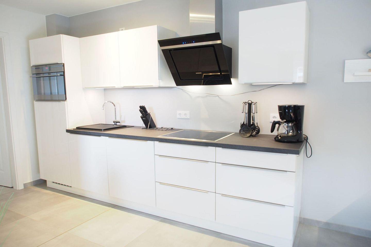 Hochwertige Marken-Küchenmöbel mit Marken-Küchengeräten, Ceranfeld mit Dunstabzugshaube, Backofen mit Mikrowellenfunktion, Geschirrspüler in Normalgröße, Kühl-Gefrierkombination (17 Liter), Kaffeemaschine, elektrischer Wasserkocher, Toaster mit Brötchenaufsatz, Eierkocher, Stabmixer, Messerblock, Töpfe und Pfannen; geschmackvolles, modernes Geschirr- und Gläsersortiment sowie Essbesteck (alles in 8-facher Ausführung) sowie reichhaltiges Zubehör bis hin zum Pizzaschneider.