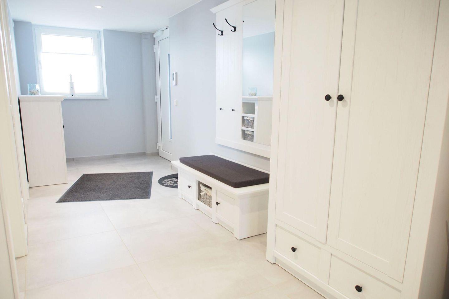 Im Flur befinden sich ein Flurschrank, eine Wandgarderobe mit einer Sitzbank und einem Spiegel, ein Schrank mit Safe, Staubsauger, Bügelbrett, Bügeleisen, Wischmop, Besen und einer kleinen Sprossenleiter.