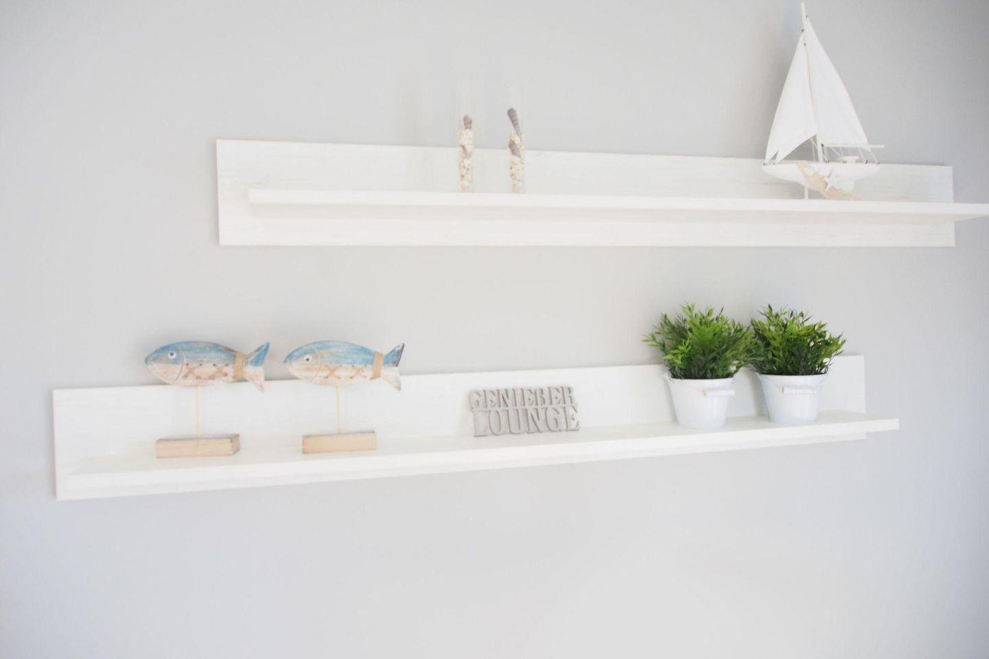 Der Wohnbereich verfügt über bequeme Leder-Sitzmöbel. Die Tische und Schränke sind im modernen, weißen Landhausstil gehalten. Bediener-freundliche Audio- und TV-Geräte, Stehlampen, Beistelltische und selbst kuschelige Decken sind vorhanden. Die Bildschirmdiagonale ist mit einer Größe von 123 cm ein Genuss für gemütliche Fernsehabende.