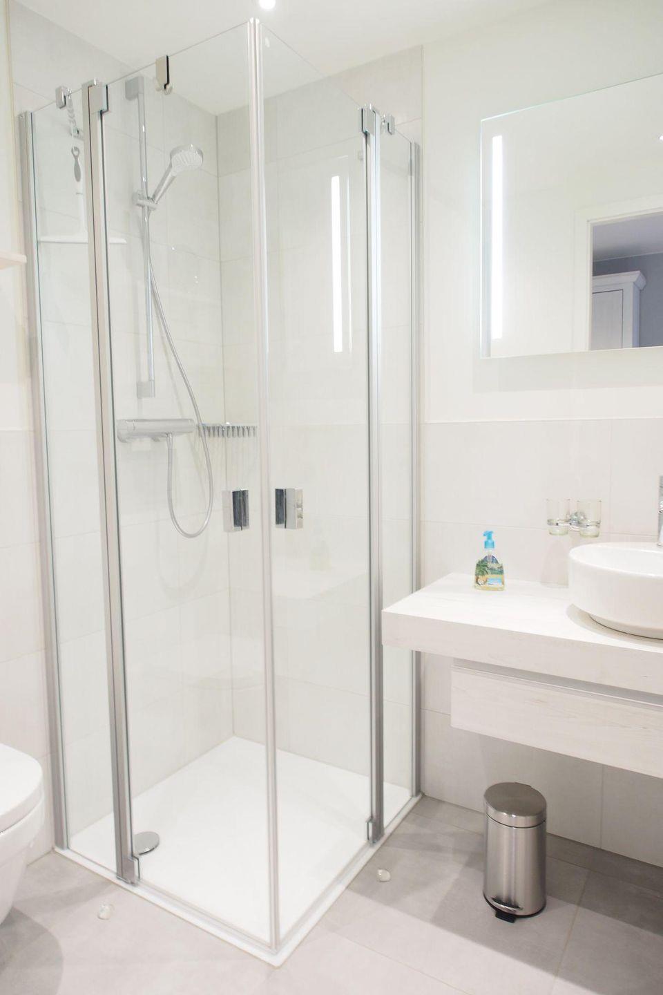 Die gefliesten Bäder verfügen jeweils über eine großzügige bodengleiche verglaste Dusche, eine Handtuchheizung, ein WC, ein modernes Aufsatz-Waschbecken mit Unterschrank, einen beleuchteten Wandspiegel und zusätzlich einen Kosmetikspiegel sowie einen Haar-Fön.