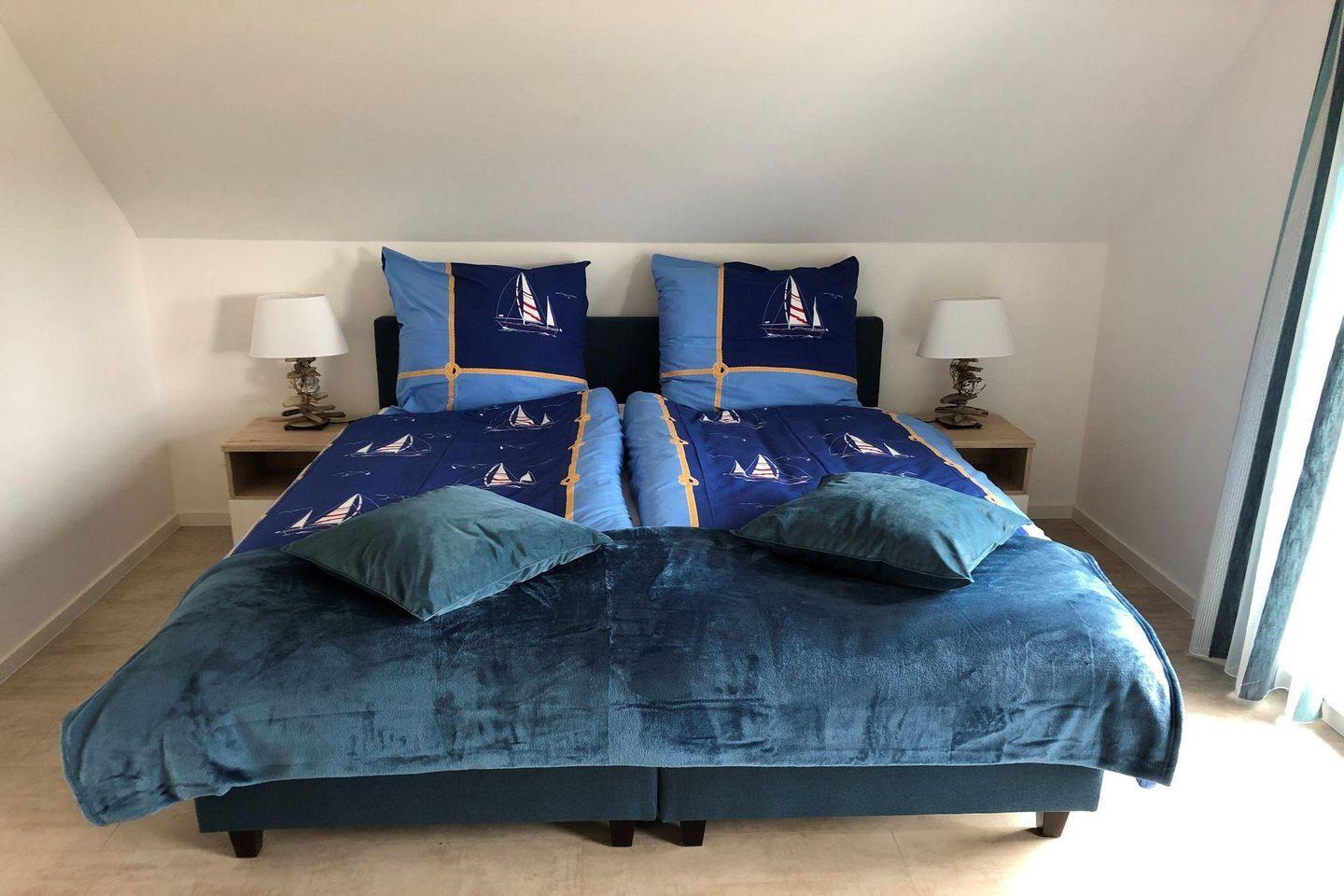 Über die Treppe gelangen Sie ins Obergeschoß mit 2 Schlafzimmern und einem Bad mit Badewanne. Das eine Schlafzimmer ist mit einem Boxspringbett (180x200), TV und einem großen, gemütlichen Sessel ausgestattet. In dem anderen Schlafzimmer befindet sich ein Boxspringbett (160x200) sowie eine Récamiere mit Schlaffunktion.