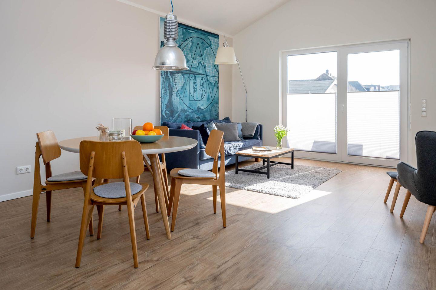 Das Wohnzimmer ist der ideale Ort für einen Spielenachmittag, zum Schmökern in der Urlaubslektüre oder für den Filmabend mit der Familie. Das gemütliche Sofa und ein separater Sessel bieten Platz für alle Mitreisenden und ein Dachfenster sorgt für mehr Licht am Tag und den Blick auf die Sterne bei Nacht. Niklas Wendt, ein befreundeter Künstler, hat uns für jedes der vier Apartments eins seiner Kunstwerke als Leihgabe überlassen. Kommen Sie für weitere Informationen gerne auf uns zu.