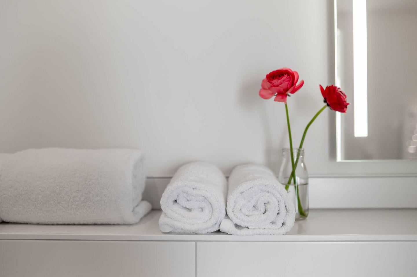 Das Appartement Mariekje verfügt über ein großzügiges Badezimmer mit Dusche (Duschkopf verfügt über vier Funktionen), Waschbecken, Handtuchtrockner, Fußbodenheizung, Kosmetikspiegel und WC.