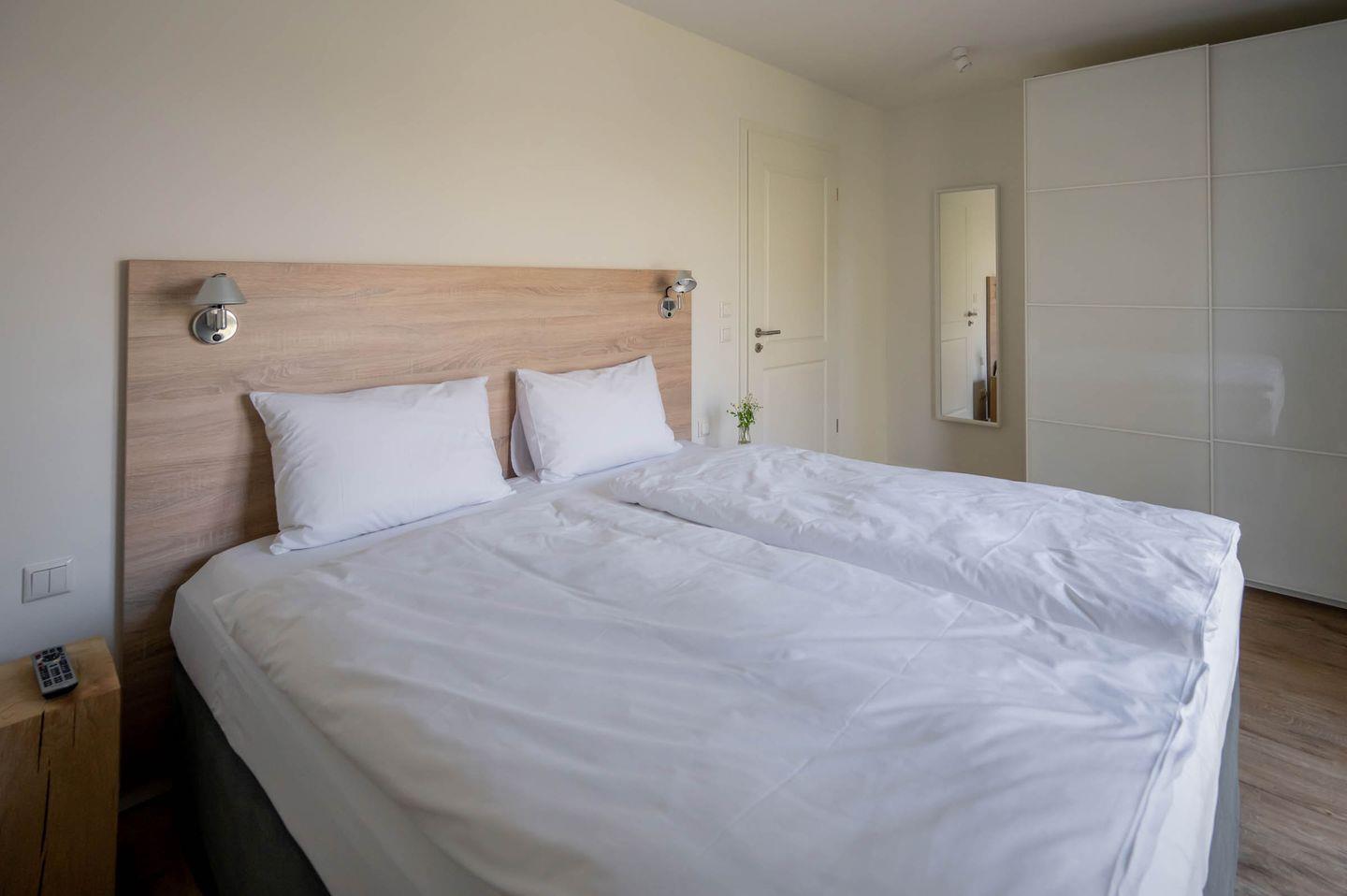 Wir sind der Überzeugung, dass ein guter Schlaf der wichtigste Faktor für einen erholsamen Urlaub und einen ausgeglichenen Start in den Tag darstellt. Deswegen haben wir viel Wert auf die Auswahl der Betten gelegt und uns für Coco-Mat-Betten aus Griechenland entschieden. Die hinterleuchtete Bettrückwand sorgt für eine gemütliche Atmosphäre und lädt dazu ein, den Tag an der Küste in Ruhe ausklingen zu lassen. Genießen Sie nach dem Aufwachen am Morgen den Blick ins Grüne oder starten Sie mit einem Kaffee/Tee und einer Folge ihrer Lieblingsserie auf dem schlafzimmereigenen Fernseher. Ein doppelter Kleiderschrank im Schlafzimmer hält genügend Platz bereit, um alles Wichtige zu verstauen und aufzuhängen.