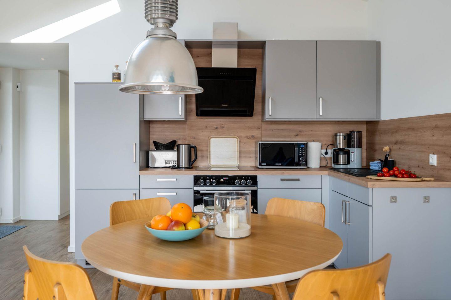 Die zum Wohnraum hin offene Küche lässt wenig Wünsche offen. Von der Zubereitung des Frühstücks samt Kaffee und Tee bis hin zum opulenten Mittag- oder Abendessen, jeder Genießer und Hobbykoch kommt hier ganz und gar auf seine Kosten. Der Esstisch ermöglicht ein gemütliches Zusammensitzen, auch nach dem Essen.