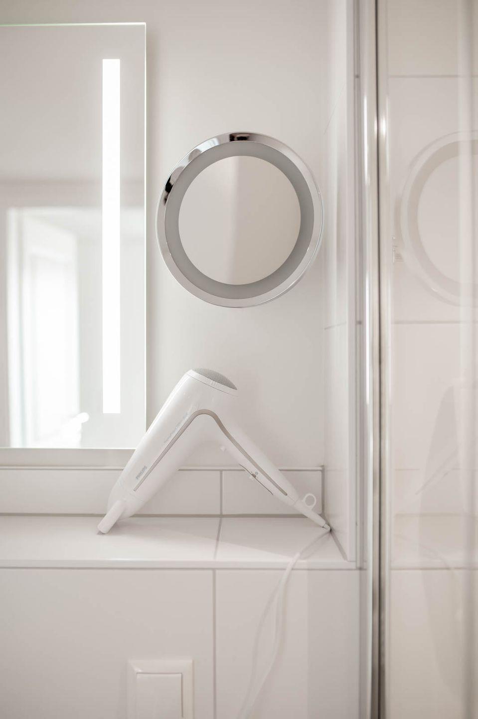 Badezimmer: Dusche, Handtuchheizung, Fön, Kosmetikspiegel