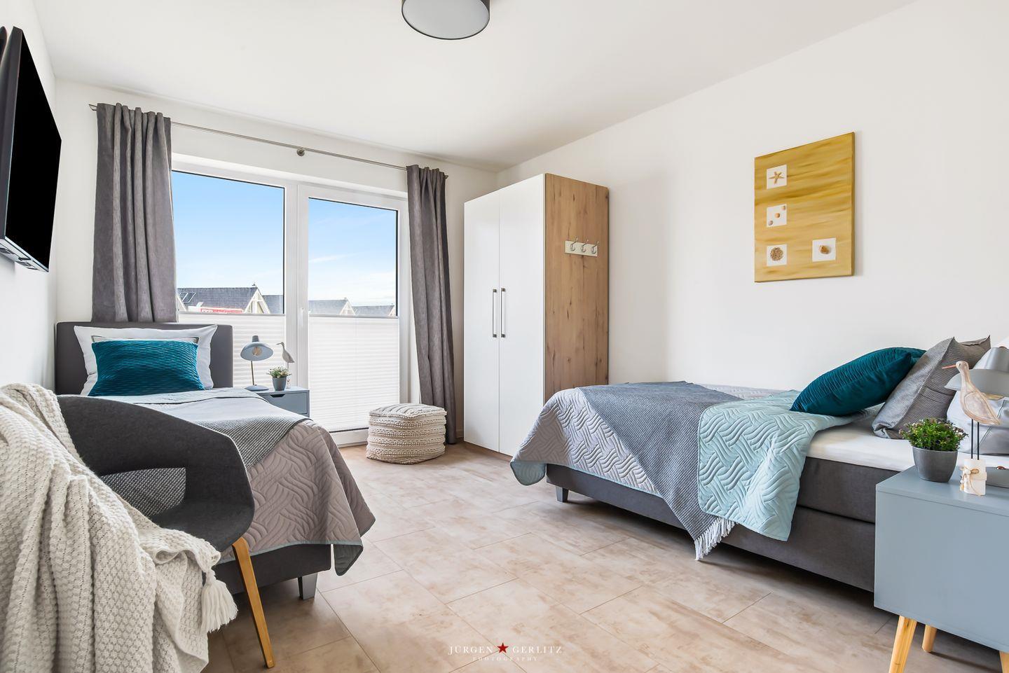 Den krönenden Abschluss für jeden Tag bereiten die Schlafzimmer. Hier können bis zu vier Personen einschlafen und mit Meeresrauschen wieder aufwachen. Beide Schlafzimmer verfügen über hochwertige Boxspringbetten und verführen zum Eintauchen und zu gemütlichen Kuschelstunden.