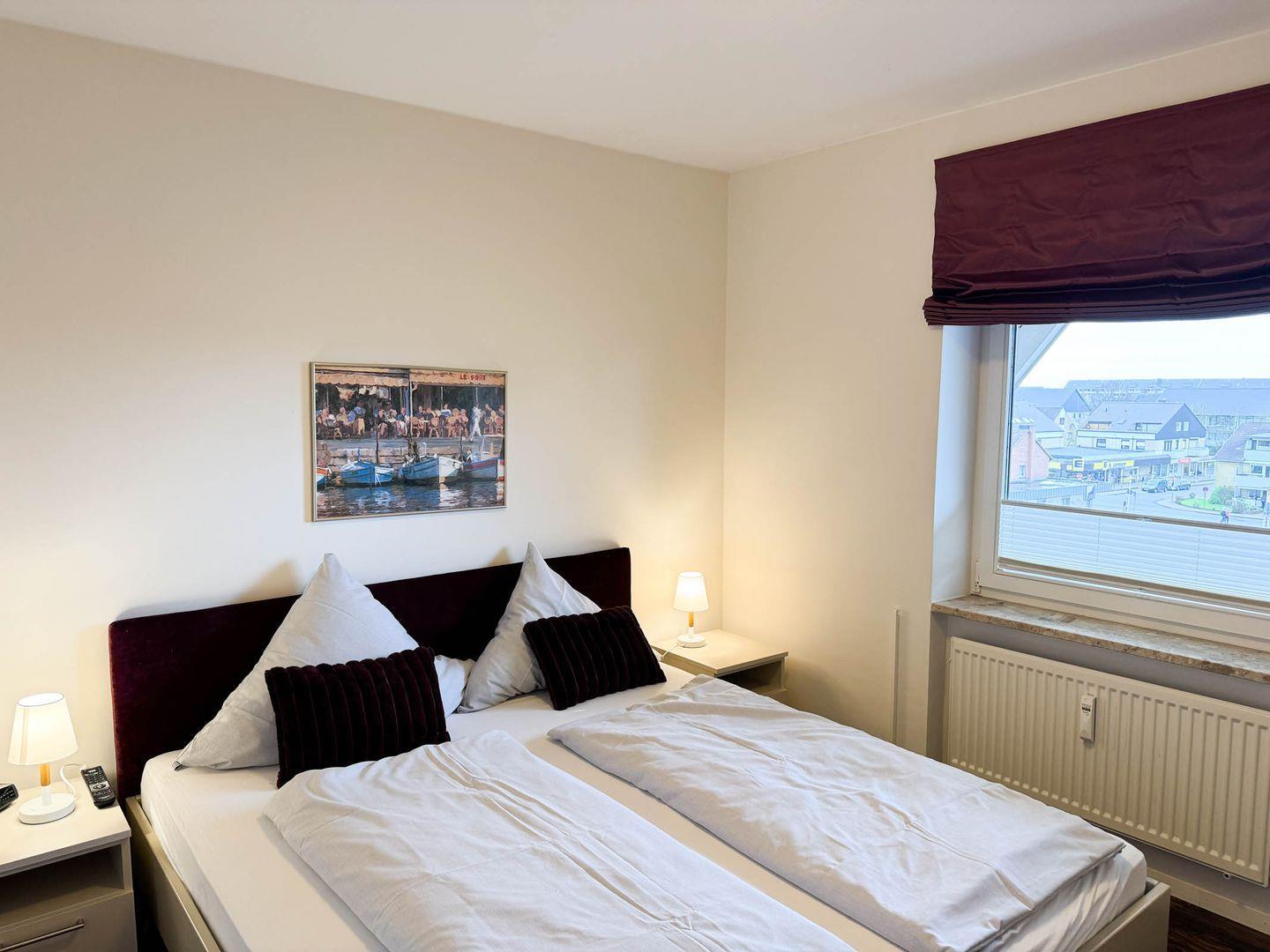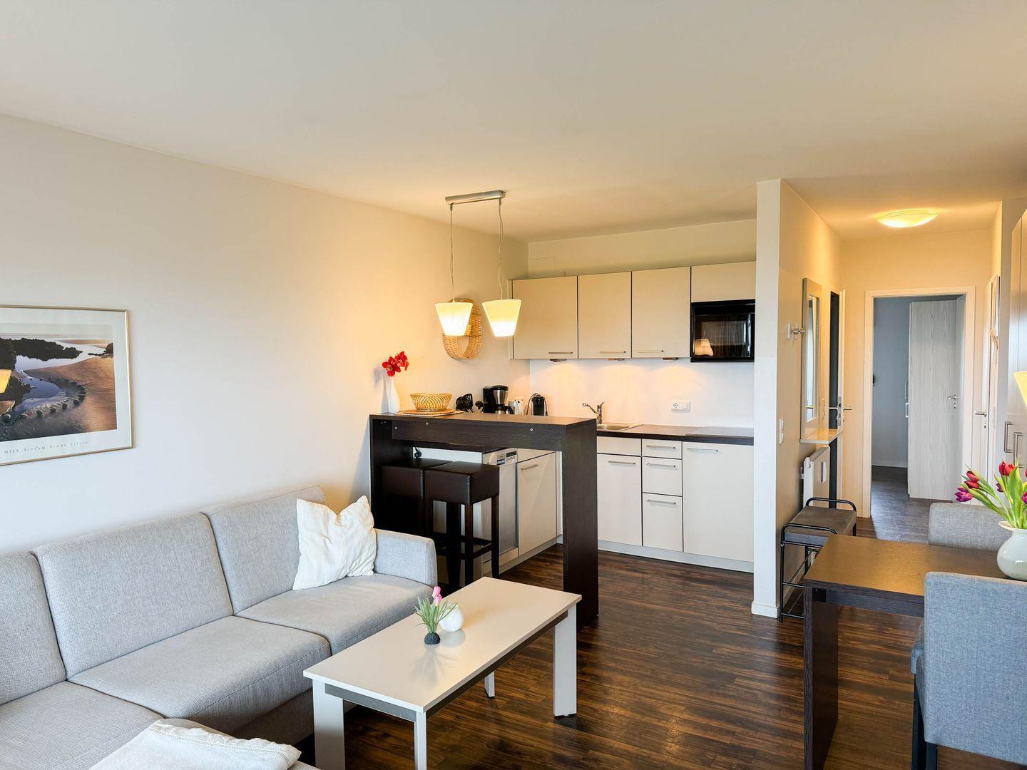 Vom eingangsnahen Parkplatz 48 erreichen Sie mittels Fahrstuhl bequem Ihr App. „Meeresleuchten“ im 4. OG. Schon beim Eintritt in den mit Einbauschränken ausgestatteten Flur öffnet sich ein grandioser Blick über den Balkon auf die Nordsee oder das Wattenmeer. Im Wohnzimmer lädt eine neue, gemütliche Couch zum Verweilen ein, die sich im Handumdrehen in ein komfortables Bett mit 14cm Kaltschaummatratze als Schlafmöglichkeit auch für eine 3. Person umwandeln lässt. Ein großer TV-Flatscreen und eine CD-Anlage mit Radio rundet das Angebot zum Unterhalten oder Entspannen ab. Von dort gelangen Sie auf den Südwestbalkon mit bequemen Balkonmöbeln und 2 Sonnenschirmen ausgestattet, von dem Sie vorbeiziehende Schiffe oder traumhafte Sonnenauf- oder -untergänge bei einem Glas Wein oder einem Imbiss genießen können. In der zum Wohnraum offen gelegenen Küche mit Espressomaschine, Mikrowelle, Geschirrspüler, Cerankochfeld, Kühlschrank mit Gefrierschrank können Sie Ihre Mahlzeiten auch an einer Essbar genießen, von der Sie auch einen schönen Blick auf das Naturerbe Wattenmeer haben. Ein weiterer Essbereich schließt sich dem offenen Wohnzimmer an. Das Schlafzimmer ist mit einem bequemen Doppelbett , genügend Stauraum in 3 Schränken, Schuhablage und einem zusätzlichen Flachbildfernseher ausgestattet. Im modernen Badezimmer finden Sie eine Dusche, WC, Handtuchheizung, Föhn und Kosmetikspiegel. Durch neue elektrische Außen-Rolläden an allen Fenstern können Sie das Appartement gegen Sonne, Tageslicht und Lärm schützen.