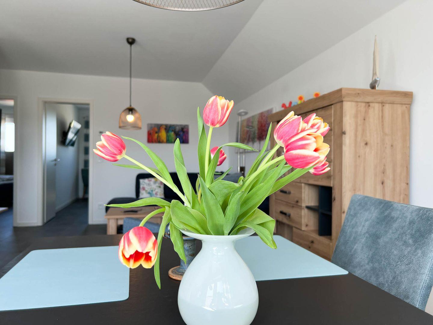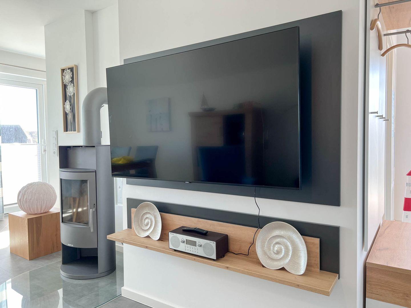 Die moderne Wohnung verfügt über einen lichtdurchfluteten Wohn- und Essbereich sowie einer voll ausgestatteten Küche mit Waschmaschine. Der Wohnbereich ist mit einer bequemen Sitzecke, einem Kamin sowie einem Smart-TV (55 Zoll) und Radio digital DAB+ ausgestattet.