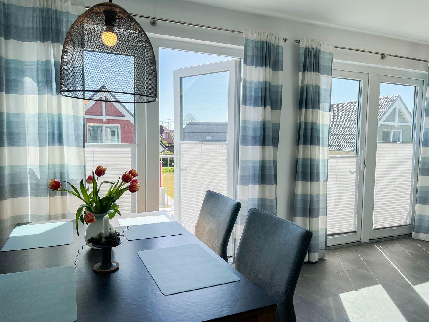 Alle Räume sind mit Plissees und Gardinen zum Sicht- und Sonnenschutz ausgestattet. Die Schlafzimmer verfügen außerdem über Insektenschutzgitter.