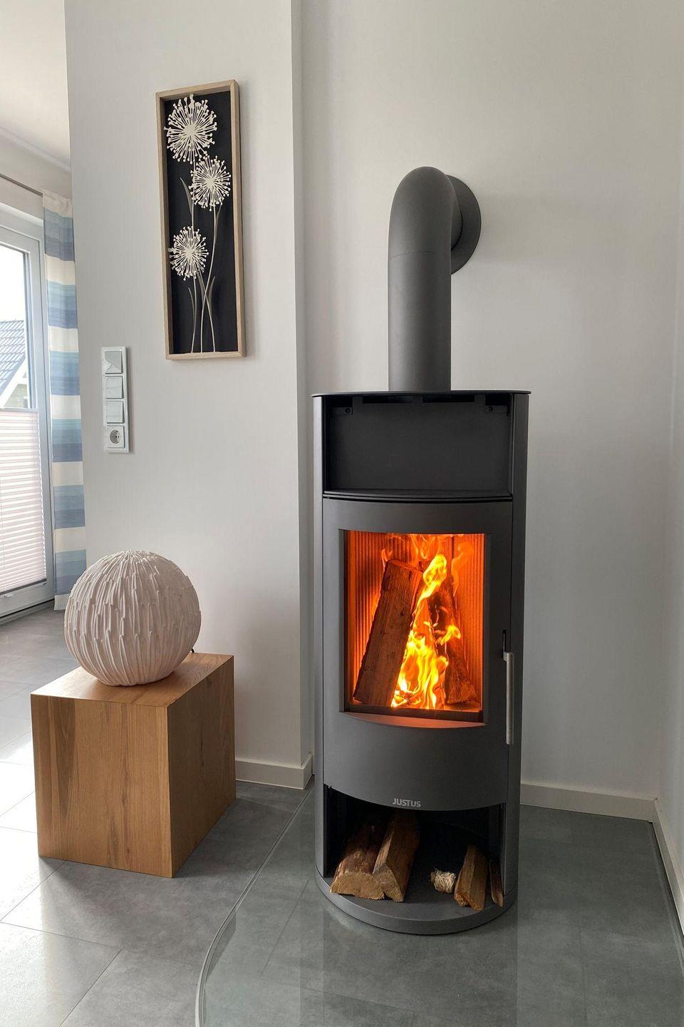 Wohn- und Essbereich: großes Ecksofa, Esstisch mit 4 Stühlen, Kaminofen