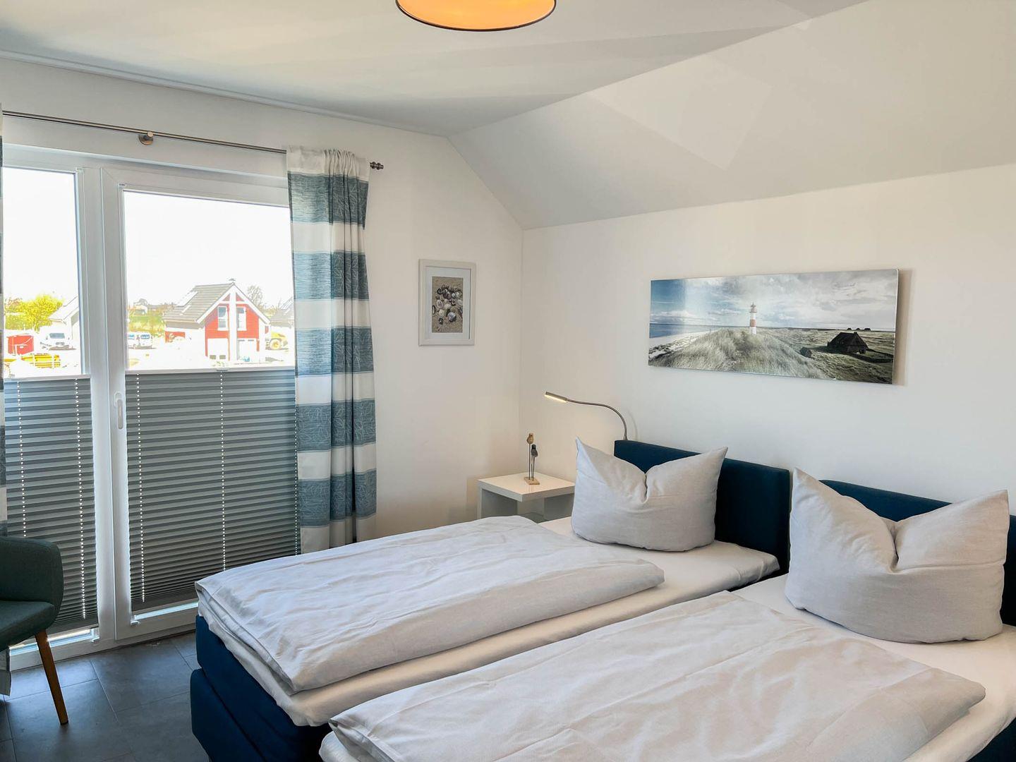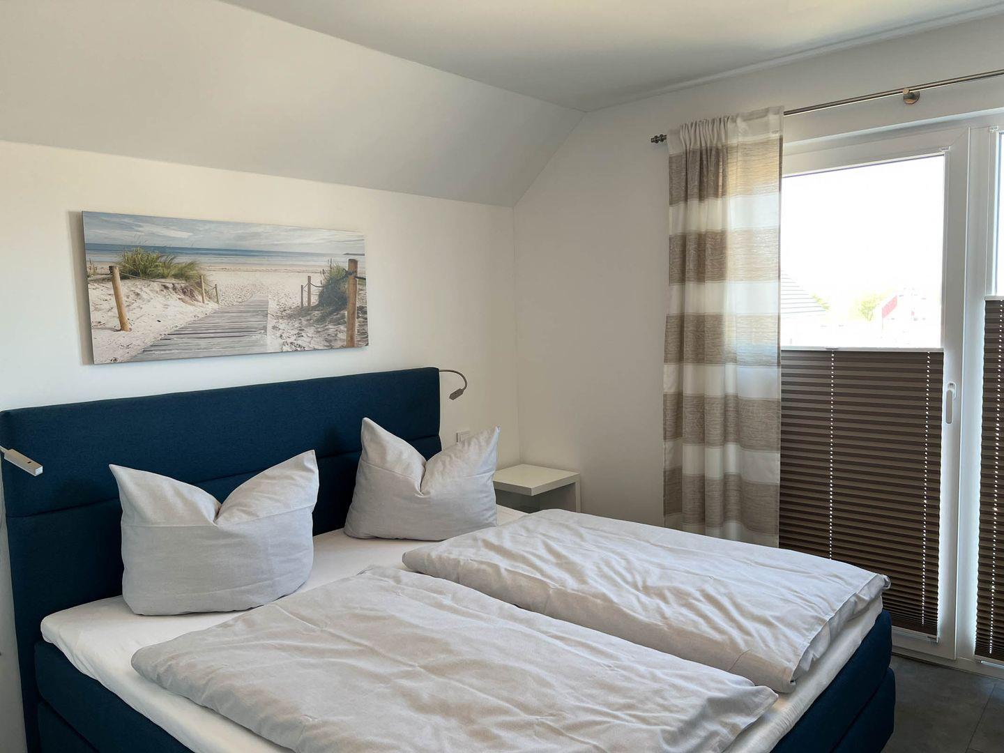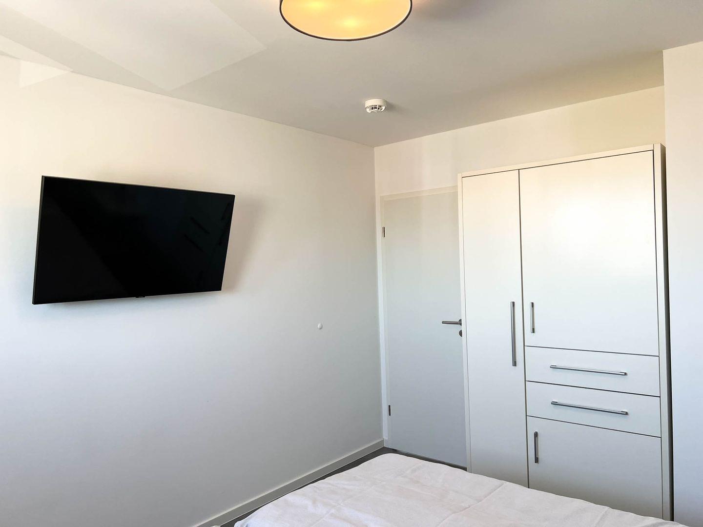 Zur Wohnung gehören zwei Schlafzimmer. Ein Zimmer ist mit einem Doppel Boxspringbett, das andere Schlafzimmer mit 2 Einzel Boxspringbetten ausgestattet, die bei Bedarf einfach zusammengestellt werden können. In beiden Schlafzimmern ist ein Smart-TV vorhanden.