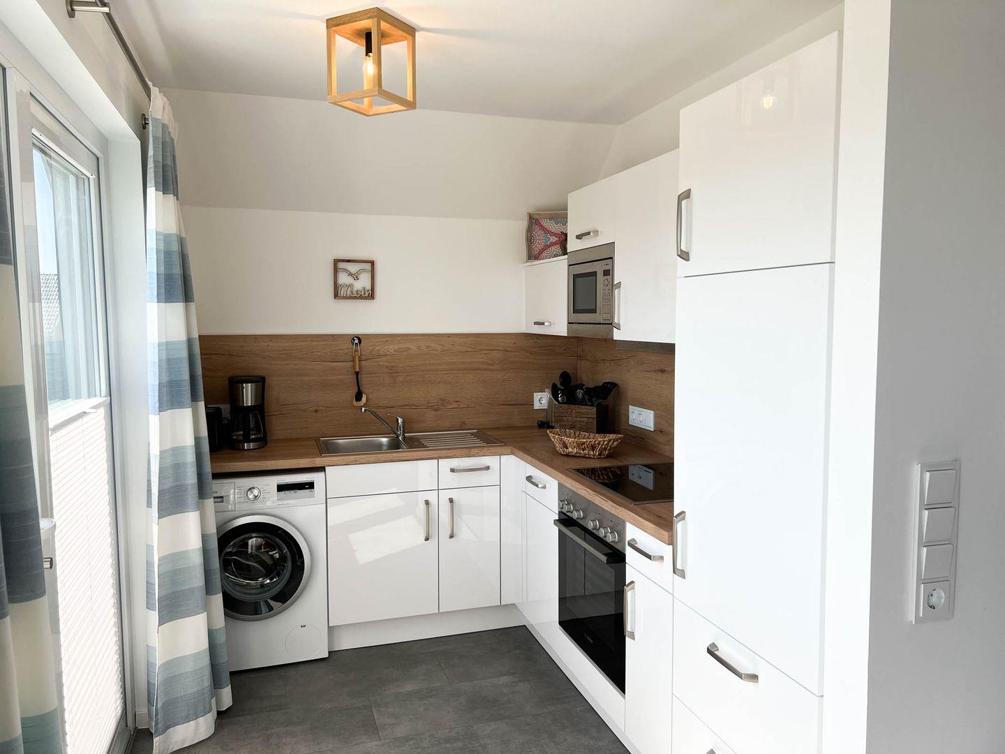 Küche: Cerankochfeld, Kühlschrank mit Gefrierfach, Backofen, Geschirrspüler, Mikrowelle, Wasserkocher, Toaster, Filterkaffee-Maschine, Waschmaschine