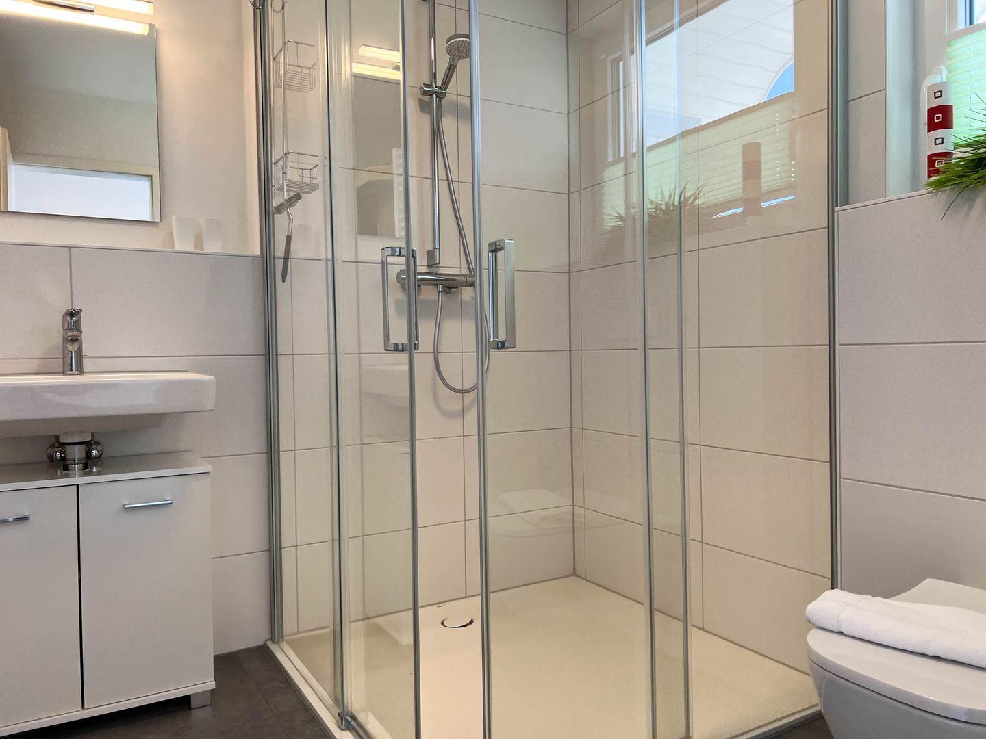 Das Tageslichtbadezimmer verfügt über eine große, ebenerdigen Duschkabine, Waschbecken mit Unterschrank, WC. Außerdem befindet sich hier eine Infrarot-Wärmekabine, in der man sich nach einem Spaziergang an der frischen Nordseeluft entspannen und herrlich durchwärmen lassen kann.