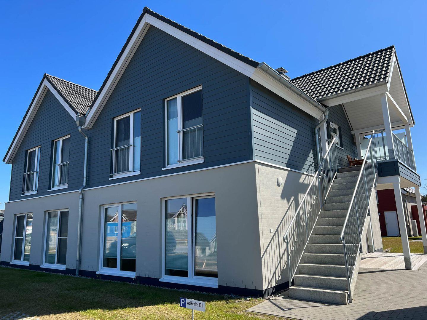 Die Ferienwohnung „Wolkenlos“ liegt im Obergeschoß eines Hauses mit 4 Wohnungen. Die Wohnung hat eine Wohn-/Nutzfläche von 80 m2 und verfügt über zwei Terrassen.