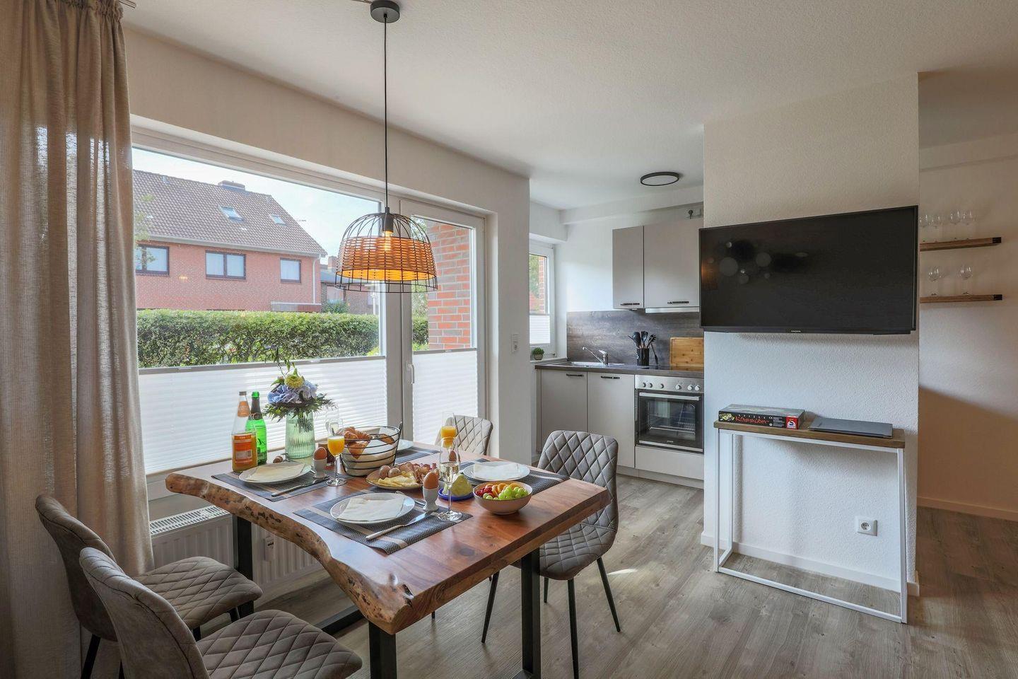 Vom eigenen Stellplatz geht‘s direkt in den Eingangsbereich des Apartmenthauses "Haus Treibholz" zur im Erdgeschoss gelegenen Ferienwohnung. Die 2021 neu sanierte Wohnung bietet mit liebevoll ausgestatteter Einrichtung einen hohen Wohlfühlcharakter.