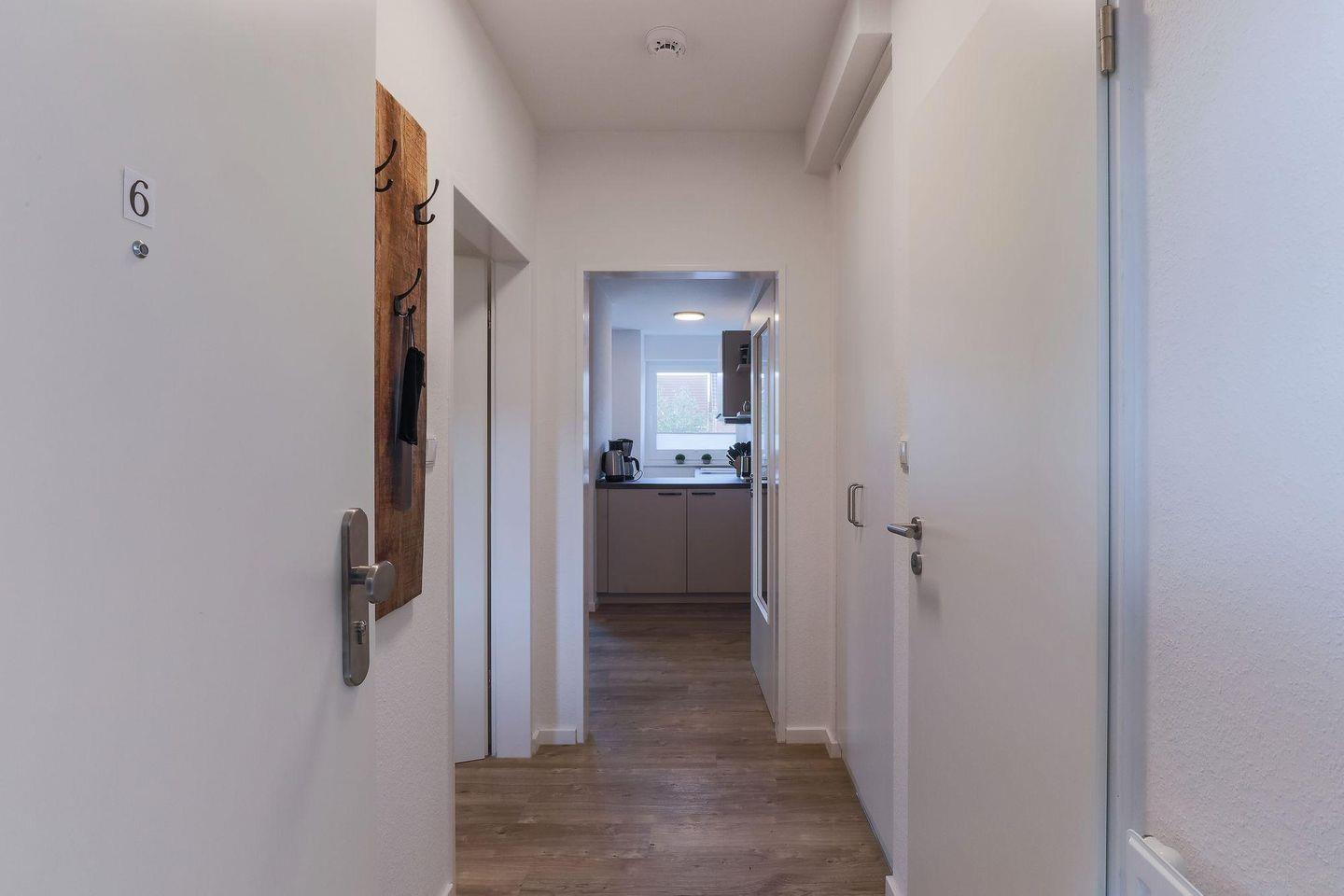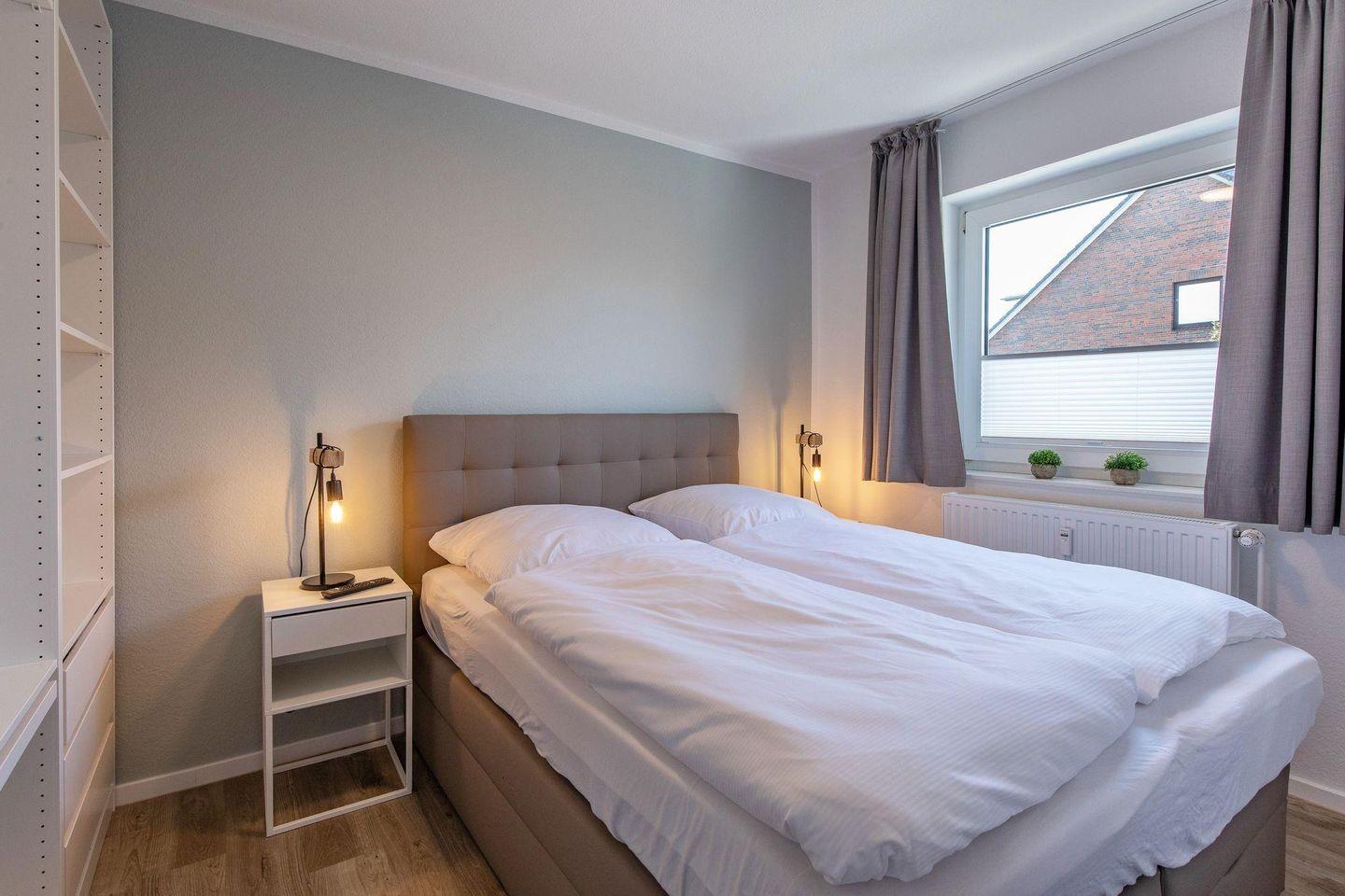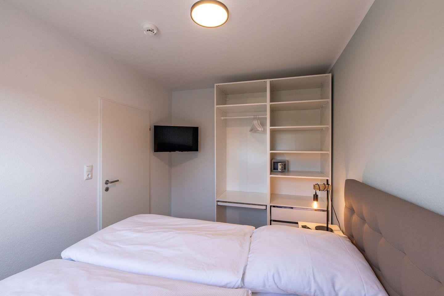 Ein heller Flur empfängt Sie mit einer modernen Garderobe und Zugängen zu sämtlichen Zimmern. Die Ferienwohnung bietet mit 2 Schlafzimmern Platz für 4 Personen. Eines der zwei Schlafzimmer ist mit einem hochwertigen Doppel-Boxspringbett (160 x 200) und ein weiteres mit zwei Einzelboxspringbetten (je 90 x 200) ausgestattet. Alle Betten verfügen über Bettkästen, sodass Sie Ihre Koffer für die Urlaubszeit verstauen können. In beiden Schlafzimmern befinden sich wandhängende TV-Flatscreens für den individuellen Fernsehgenuss.