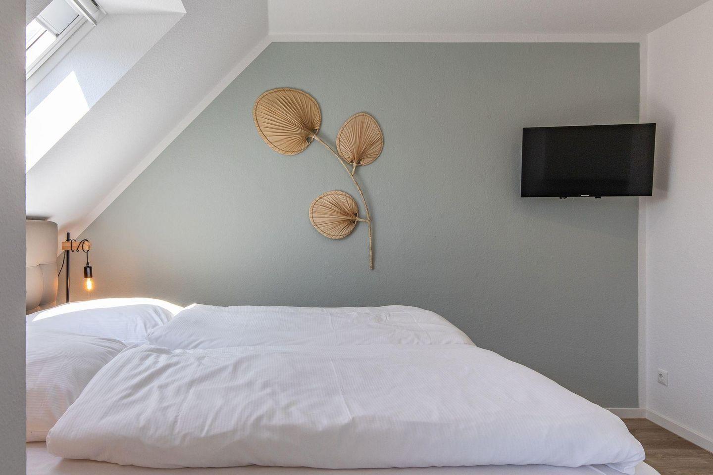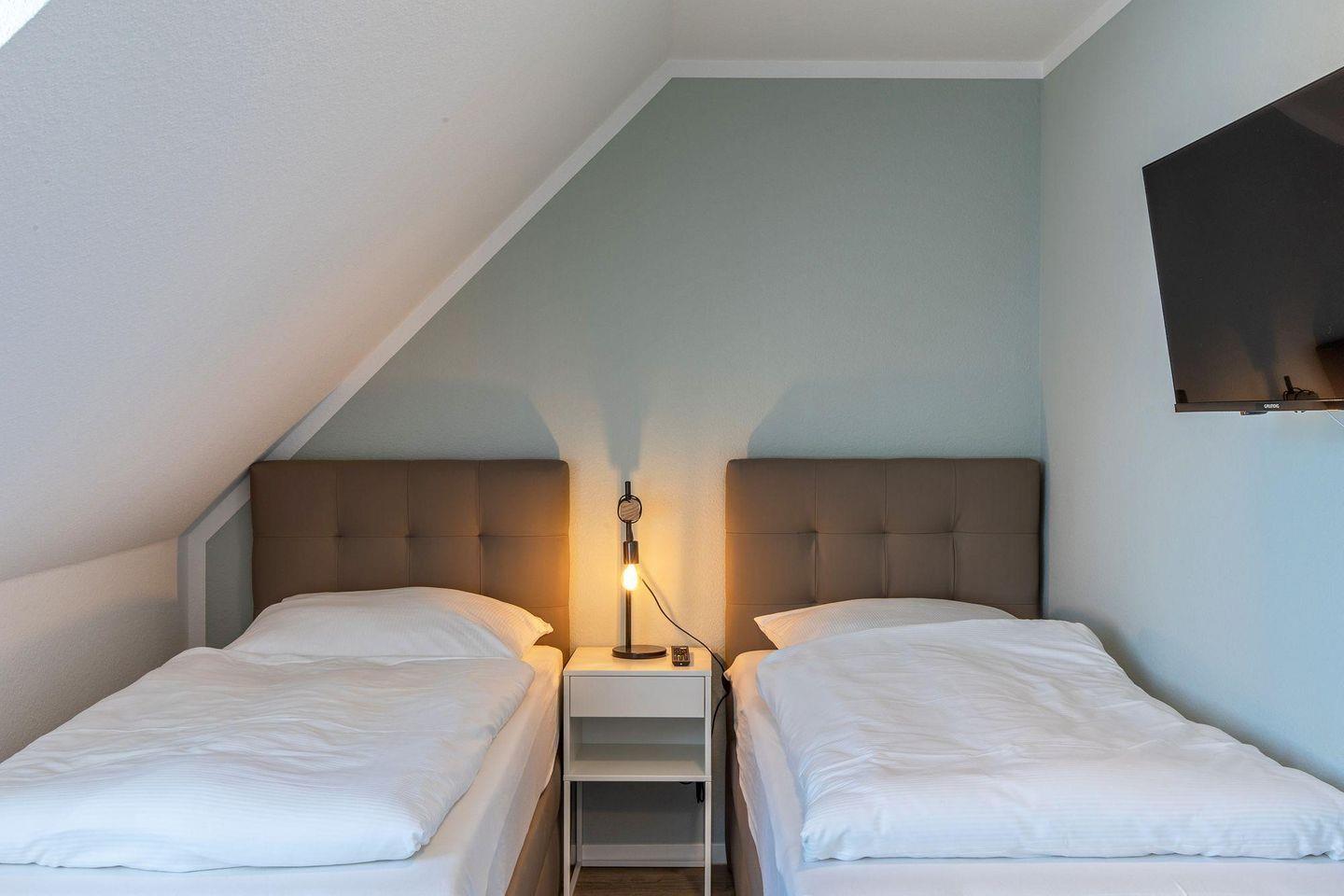 Ein heller Flur empfängt Sie mit einer modernen Garderobe und Zugängen zu sämtlichen Zimmern. Die Ferienwohnung bietet mit 2 Schlafzimmern Platz für 4 Personen. Eines der zwei Schlafzimmer ist mit einem hochwertigen Doppel-Boxspringbett (180 x 200) und ein weiteres mit 2 Einzelboxspringbetten (je 90 x 200) ausgestattet. Sämtliche Betten verfügen über Bettkästen, sodass Sie Ihre Koffer für die Urlaubszeit verstauen können. In beiden Schlafzimmern befinden sich wandhängende TV-Flatscreens für den individuellen Fernsehgenuss.