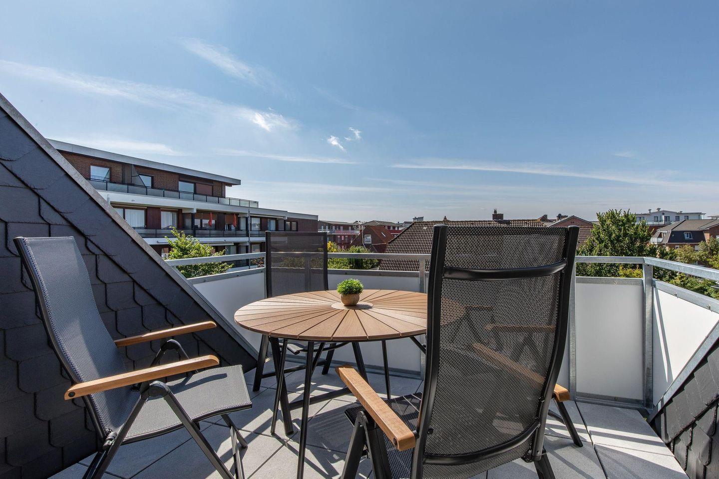 Balkon: Südwest-Lage mit hochwertigen Balkonmöbeln und Sonnenschirm
