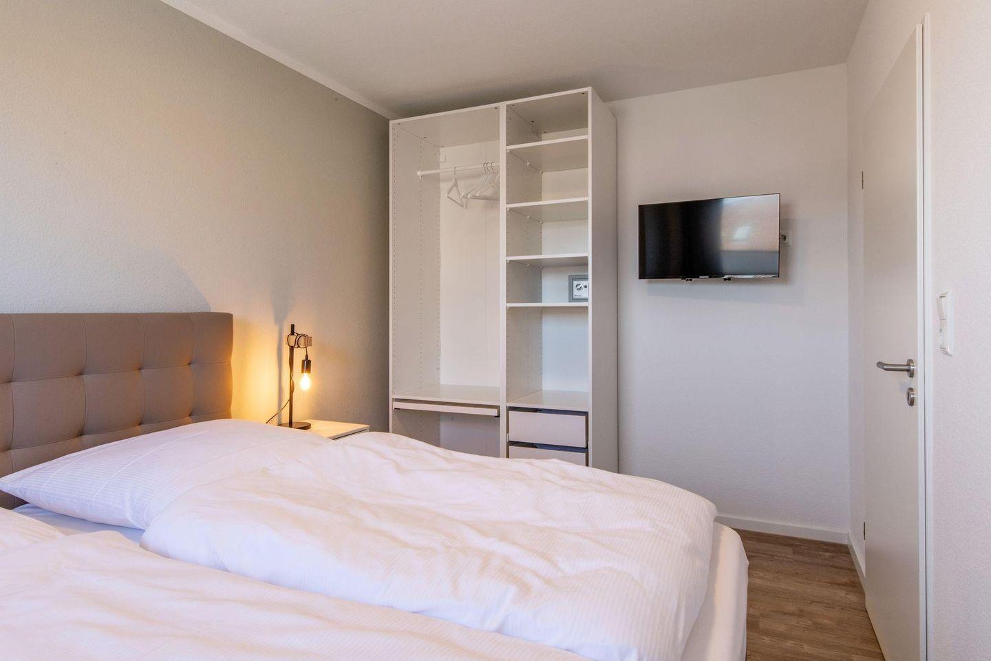 Ein heller Flur empfängt Sie mit einer modernen Garderobe und Zugängen zu sämtlichen Zimmern. Die Ferienwohnung bietet mit 1 Schlafzimmer Platz für 2 Personen. Das Schlafzimmer ist mit einem hochwertigen Doppel-Boxspringbett (180 x 200) ausgestattet. Das Bett verfügt über Bettkästen, sodass Sie Ihre Koffer für die Urlaubszeit verstauen können. Im Schlafzimmer befindet sich ein wandhängender TV-Flatscreen für den individuellen Fernsehgenuss.