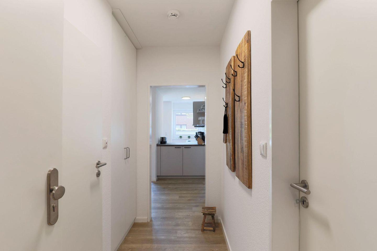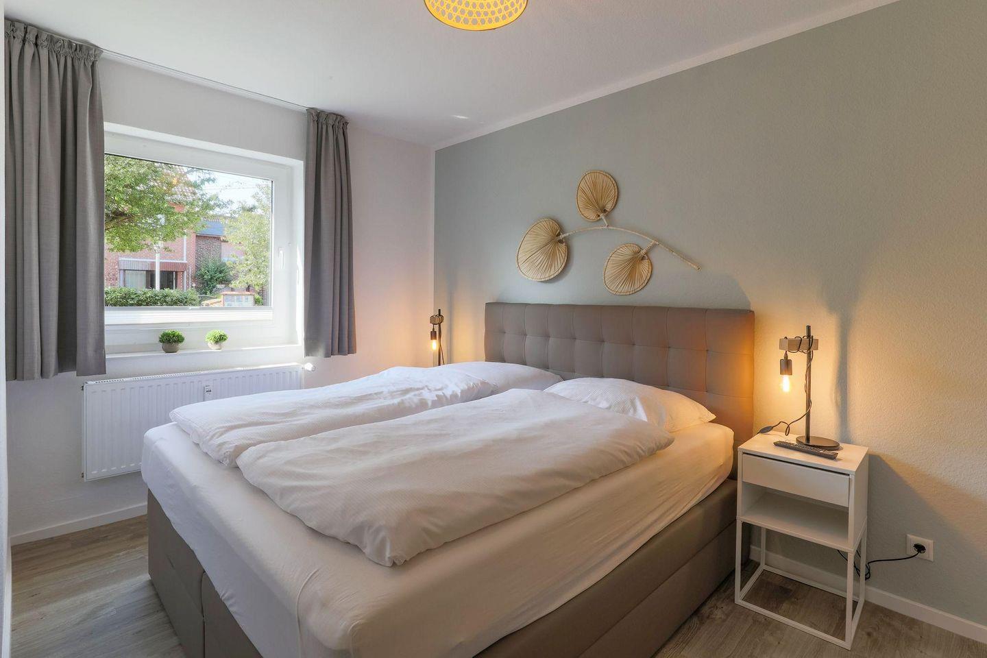 Ein heller Flur empfängt Sie mit einer modernen Garderobe und Zugängen zu sämtlichen Zimmern. Die Ferienwohnung bietet mit 2 Schlafzimmern Platz für 4 Personen. Eines der zwei Schlafzimmer ist mit einem hochwertigen Doppel-Boxspringbett (180 x 200) und ein weiteres mit zwei Einzelboxspringbetten (je 90 x 200) ausgestattet. Alle Betten verfügen über Bettkästen, sodass Sie Ihre Koffer für die Urlaubszeit verstauen können. In beiden Schlafzimmern befinden sich wandhängende TV-Flatscreens für den individuellen Fernsehgenuss.