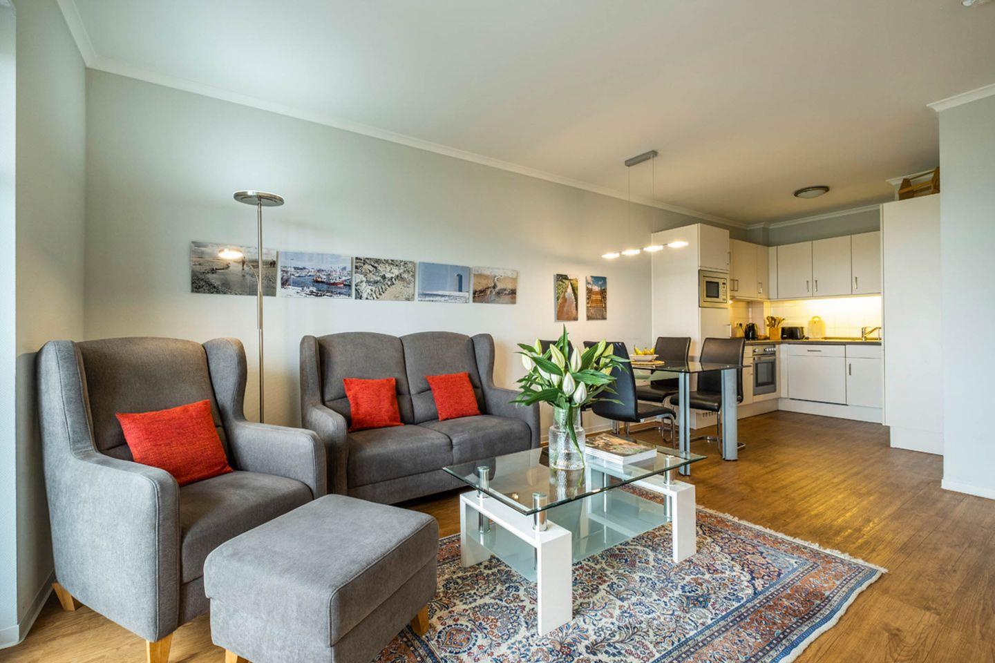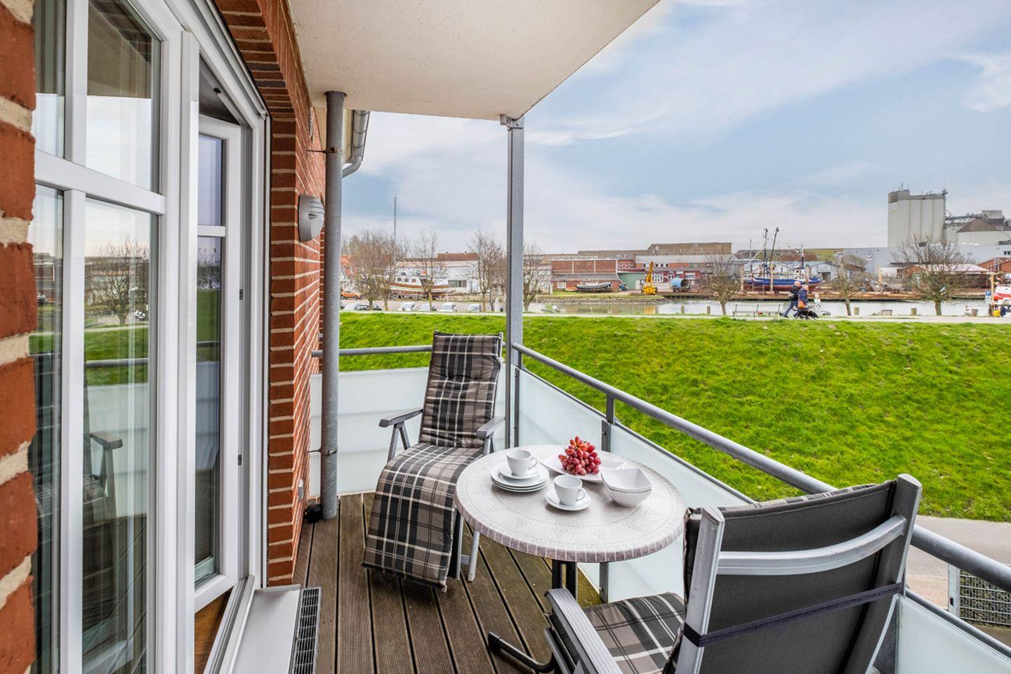 Das Appartement 2.3 mit Balkon liegt im zweiten Obergeschoss des Hauses Hafenresidenz. Im Wohnzimmer finden Sie eine gemütliche Couchgarnitur mit einen Fernsehsessel vor. Die Küche und der Essbereich sind im Wohnbereich integriert. Das Schlafzimmer ist mit einen Doppelbett und TV-Wandmontage ausgestattet. Die Lattenroste des Bettes sind elektrisch verstellbar. Das geräumige Duschbad verfügt über einen Handtuchtrockner, Haltegriffe am WC und in der Dusche. Die Dusche hat eine kleine Einstiegskante. Fußbodenheizung im ganzen Appartement. Vom Wohnzimmer gelangen Sie auf den Balkon, der in Südwestlage liegt. Das Appartement verfügt über elektrische Außenjalousien und über eine Gegensprechanlage mit Kamera. Im Erdgeschoß des Hauses finden Sie Waschmaschine und Trockner (gebührenpflichtig) und einen Abstellraum für Fahrräder. Das Haus verfügt über einen Aufzug.