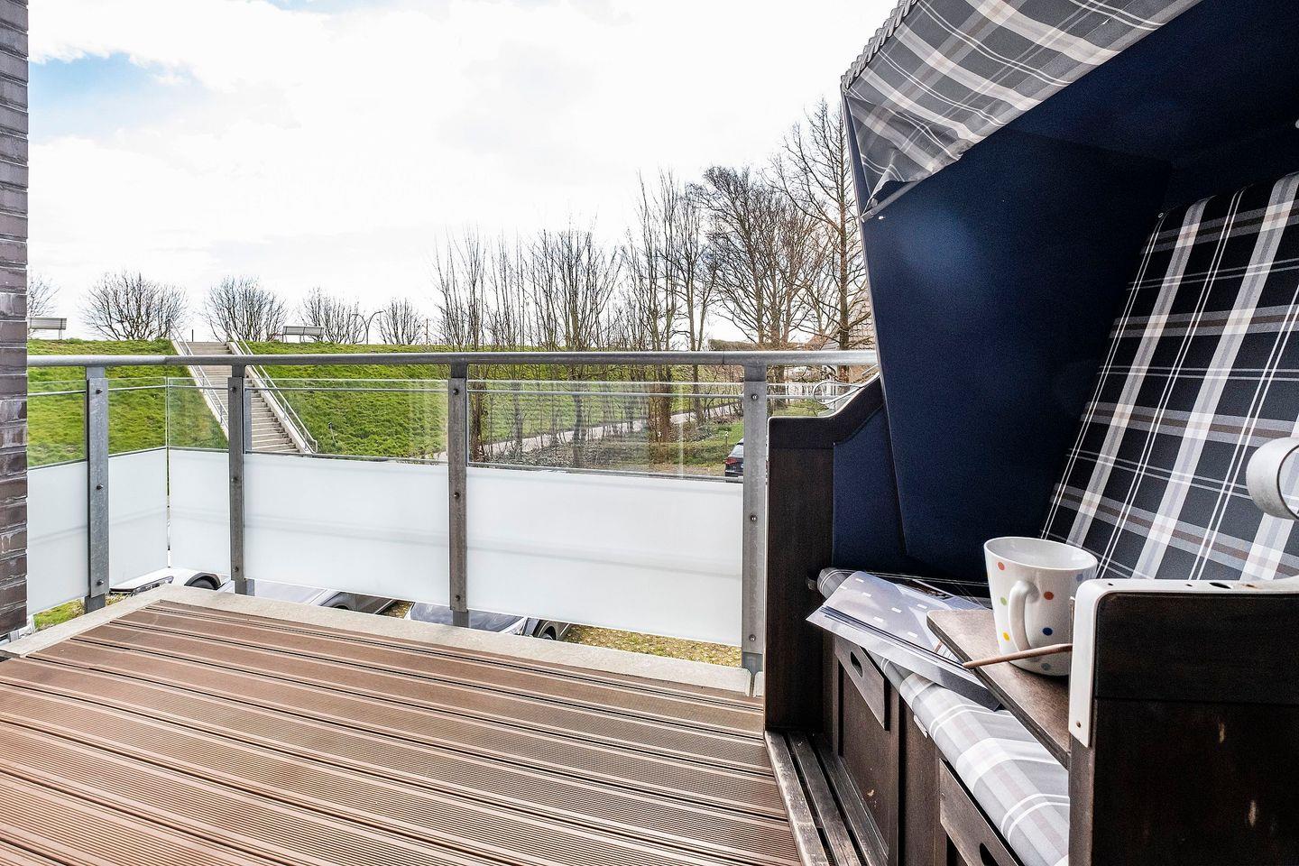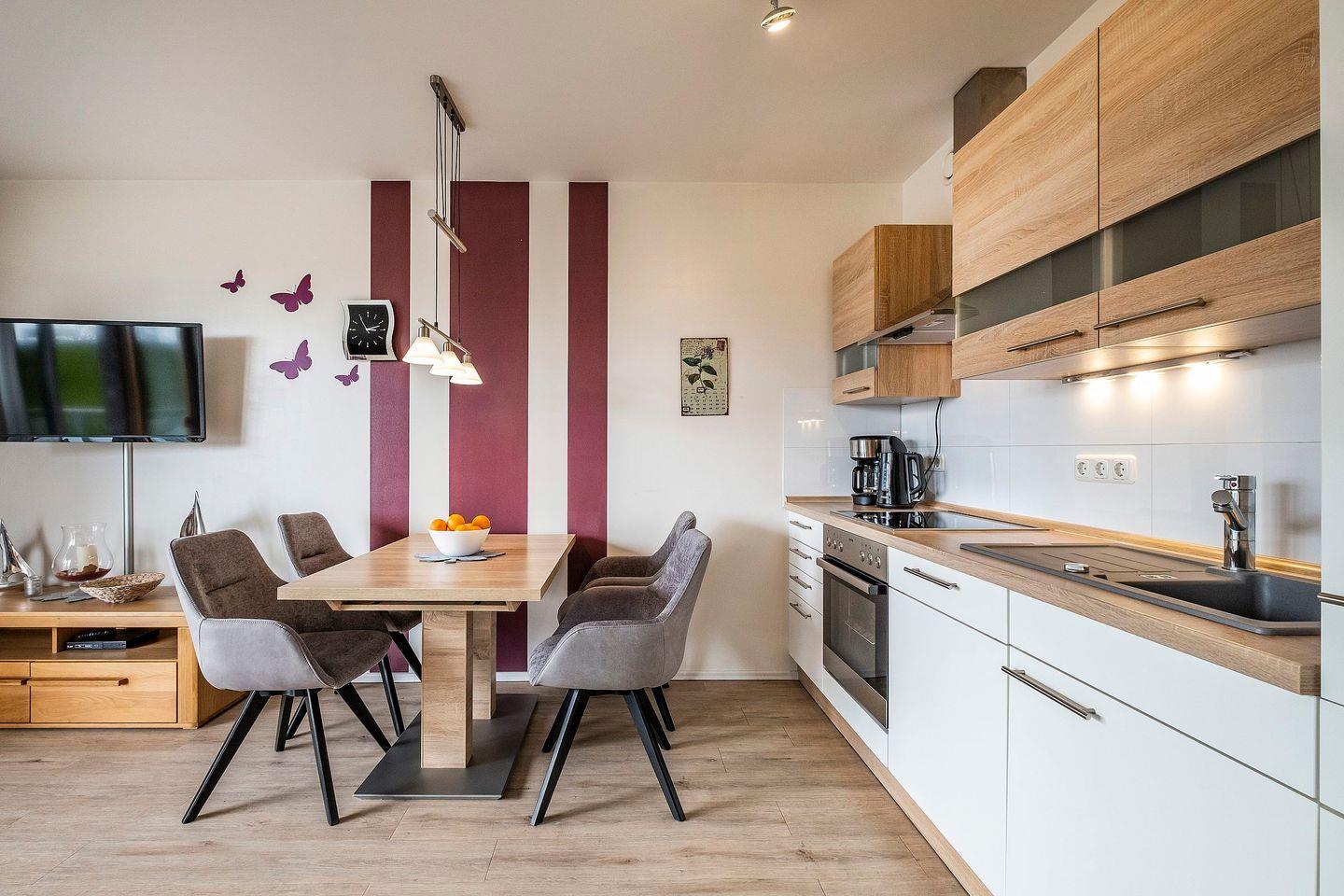 Die Ferienwohnung 1.4 ist eine helle, moderne 2-Raum-Wohnung mit Balkon im I. Obergeschoss. Die Küchenzeile und der Essbereich sind direkt im Wohnbereich integriert. Das geräumige Duschbad ist barrierefrei und verfügt über eine ebenerdige Dusche, WC, Handtuchtrockner und Haar-Föhn. Vom Wohnbereich gelangen Sie direkt auf den Balkon.