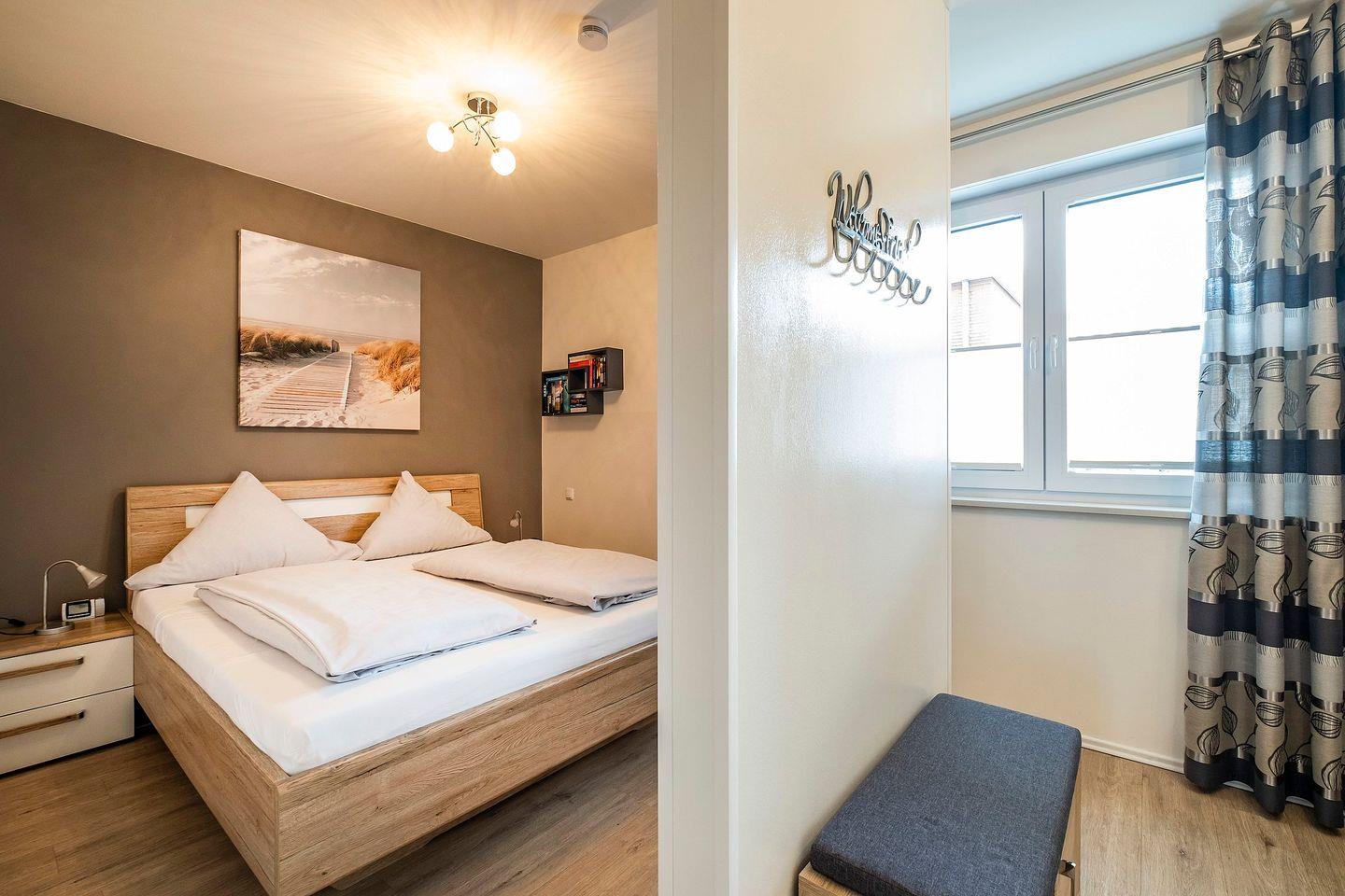 Das Schlafzimmer ist mit einem Doppelbett (durchgehender Topper 180 x 200 cm) und einem Fernseher ausgestattet.