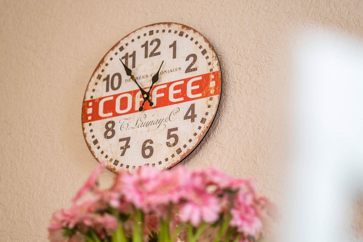 Küchenzeile: Geschirrspüler, Kochfeld, Mikrowelle, Kühlschrank mit Gefrierfunktion, Heißwasserkocher, Kaffeemaschine, Toaster.