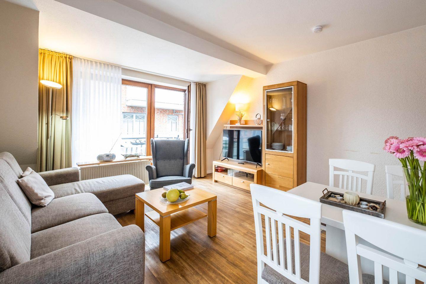 Die Ferienwohnung 4 liegt im 1. Obergeschoss und verfügt über einen Balkon in West-Lage. Es gibt leider keinen Aufzug im Haus.