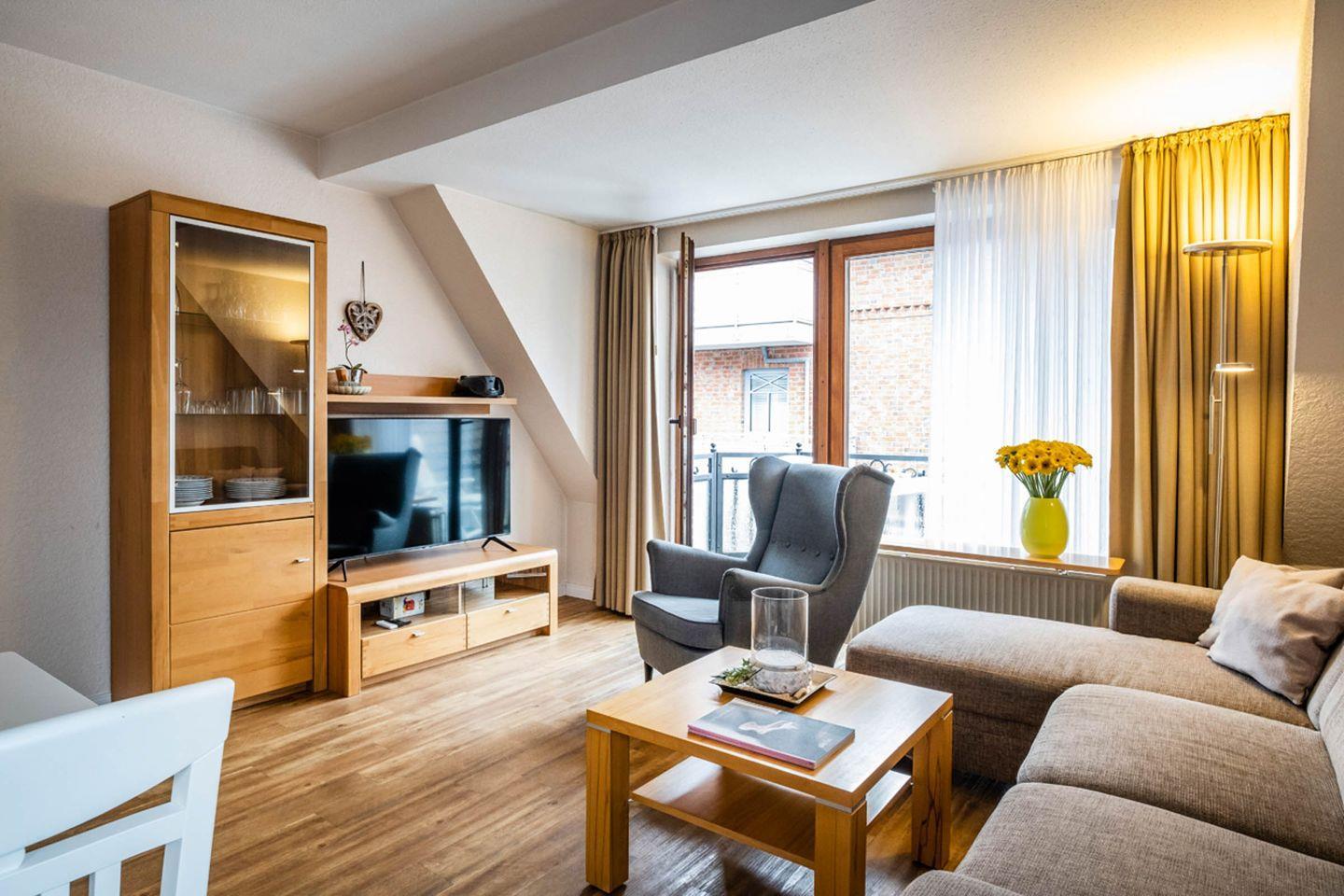 Die Ferienwohnung 6 liegt im 1. Obergeschoss und verfügt über einen Balkon in West-Lage. Es gibt leider keinen Aufzug im Haus.