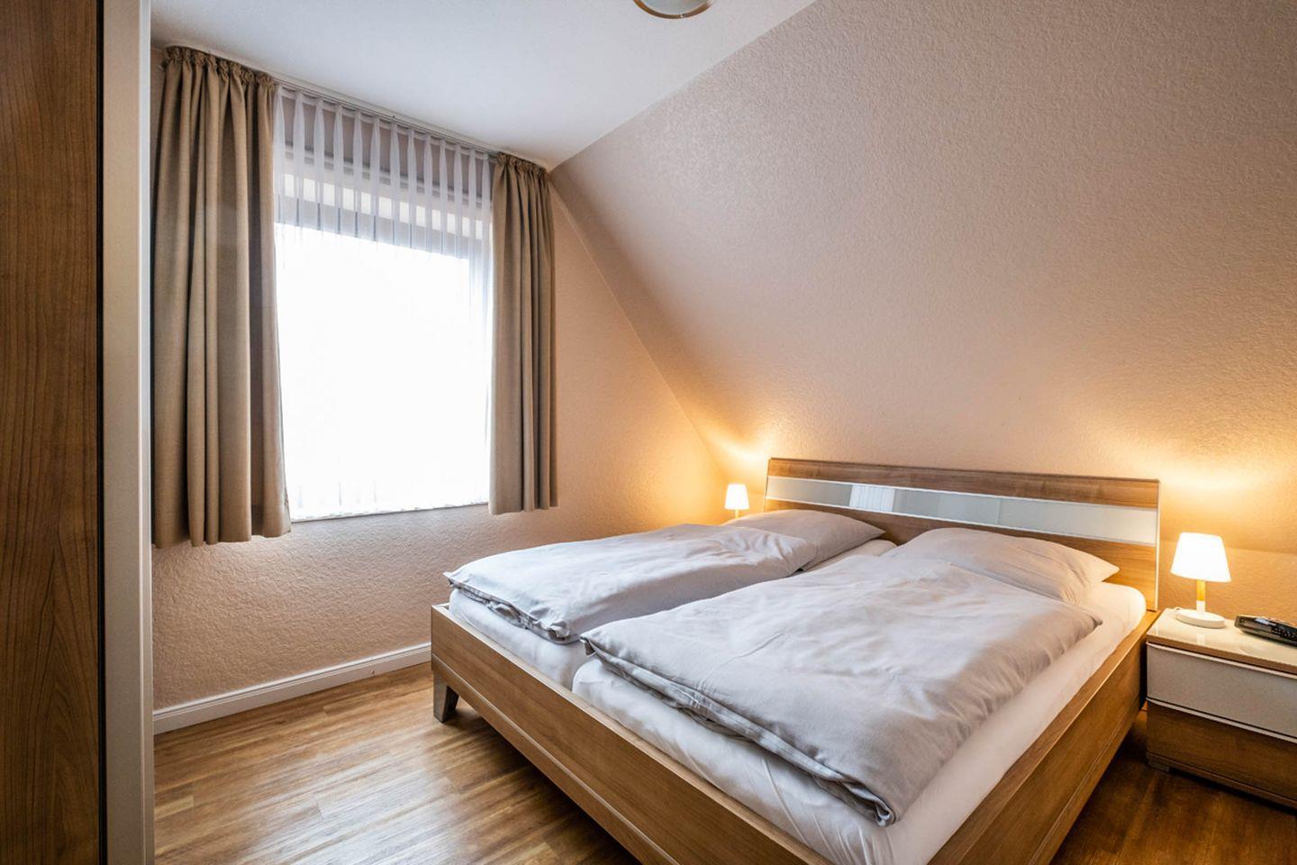 Das Bad verfügt über eine Dusche/WC. Vom Wohnbereich gelangen Sie auf den Balkon. Das eine Schlafzimmer verfügt über ein Doppelbett und das zweite Schlafzimmer über 2 Einzelbetten. Der Wohnung ist ein PKW - Stellplatz direkt am Haus zugehörig. Einen offenen Fahrradunterstand halten wir für Sie bereit.