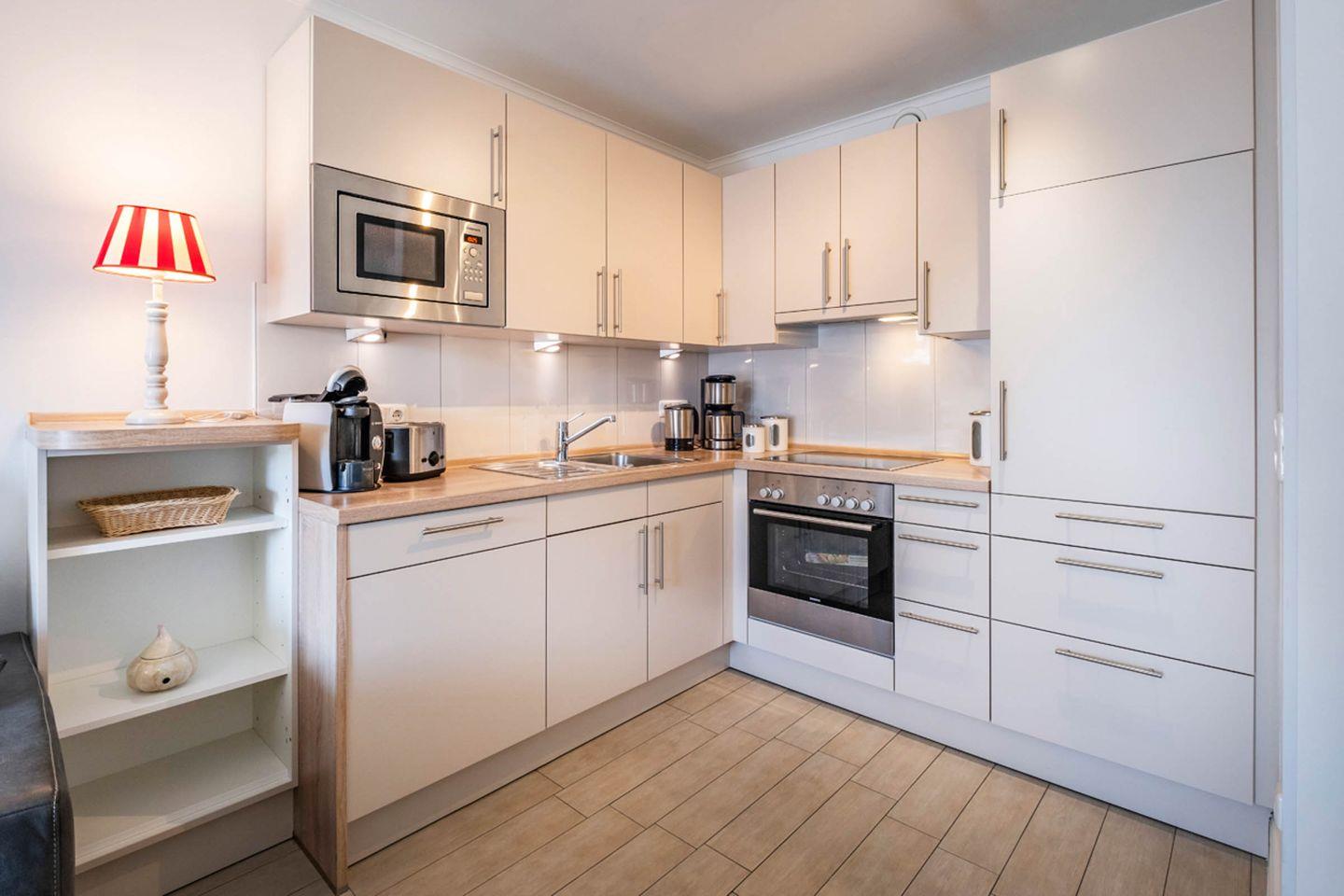 Küche: Backofen, Herd mit Cerankochfeld, Mikrowelle, Geschirrspüler, Kühlschrank mit Gefrierfach, Kaffeemaschine, Wasserkocher, Toaster