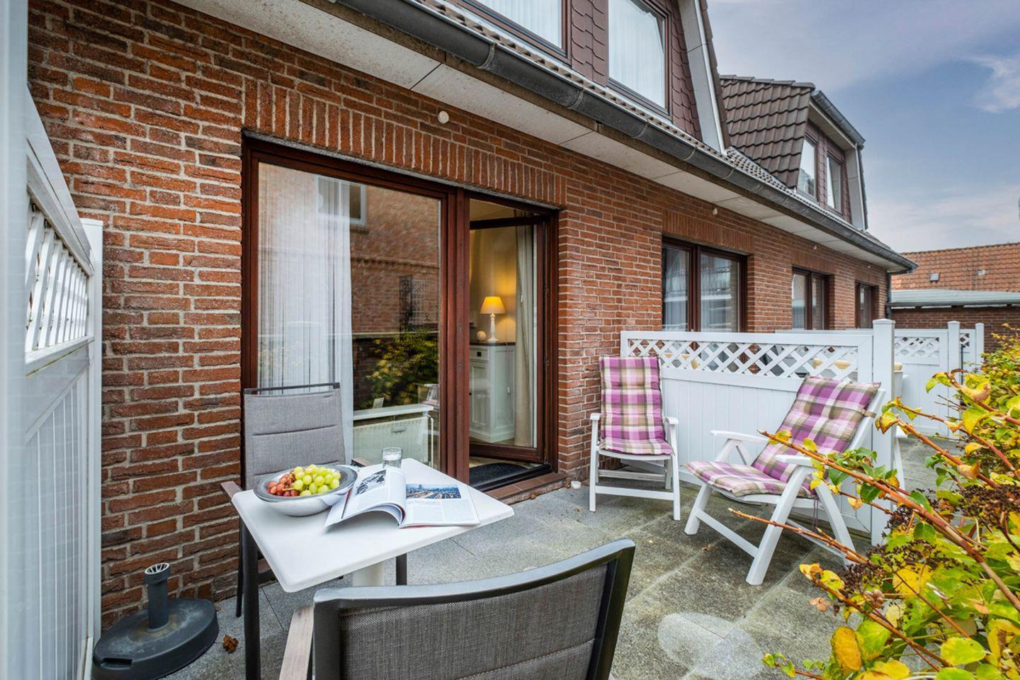 Die Ferienwohnung 12 ist eine Maisonette-Wohnung und verfügt über eine Terrasse in West-Lage.