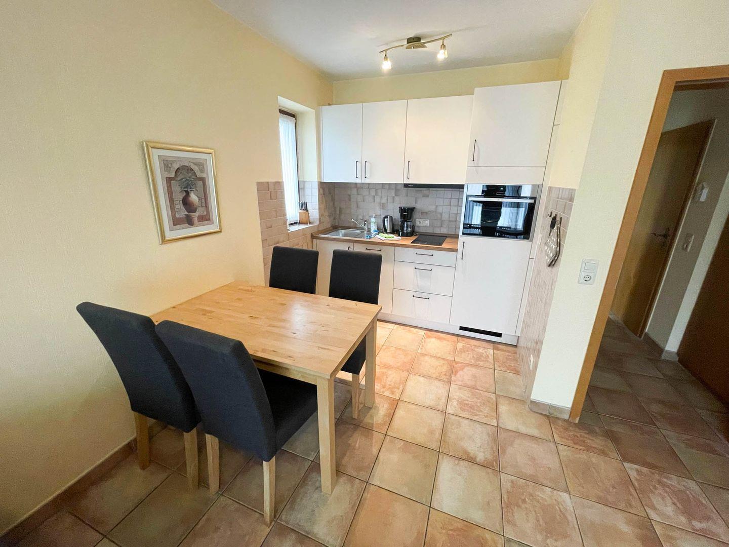 Küchenzeile: 4 Platten-Herd, Backofen, Geschirrspüler, Kühlschrank mit Gefrierfach, Kaffeemaschine, Wasserkocher, Toaster