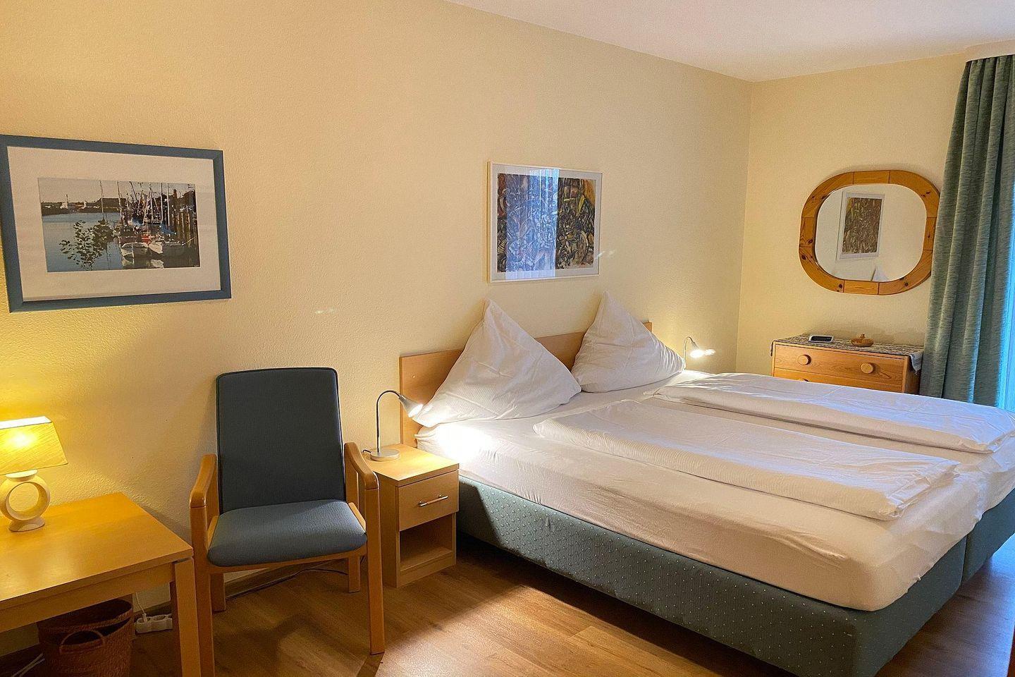 Beide Schlafzimmer sind mit Doppelbetten ausgestattet, wobei das eine Bett 1.90 m und das andere Bett 2.00 m lang ist. Das Bad verfügt über eine Dusche/WC. Vom Wohnzimmer, der Küche und einem der Schlafzimmer gelangt man auf den in Südwestlage liegenden Balkon.