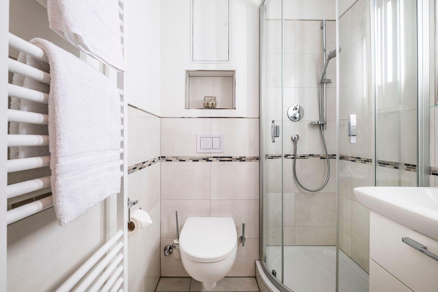 1 Wohnzimmer mit Essbereich, eine kleine Küche,1 Schlafzimmer und 1 Duschbad .