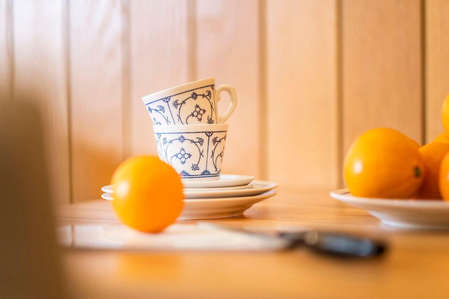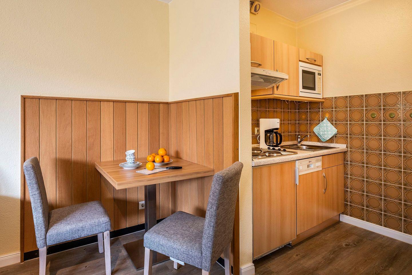 Küchenzeile: Geschirrspüler, Kochfeld, Mikrowelle, Kühlschrank mit Gefrierfunktion, Heißwasserkocher, Kaffeemaschine, Toaster.