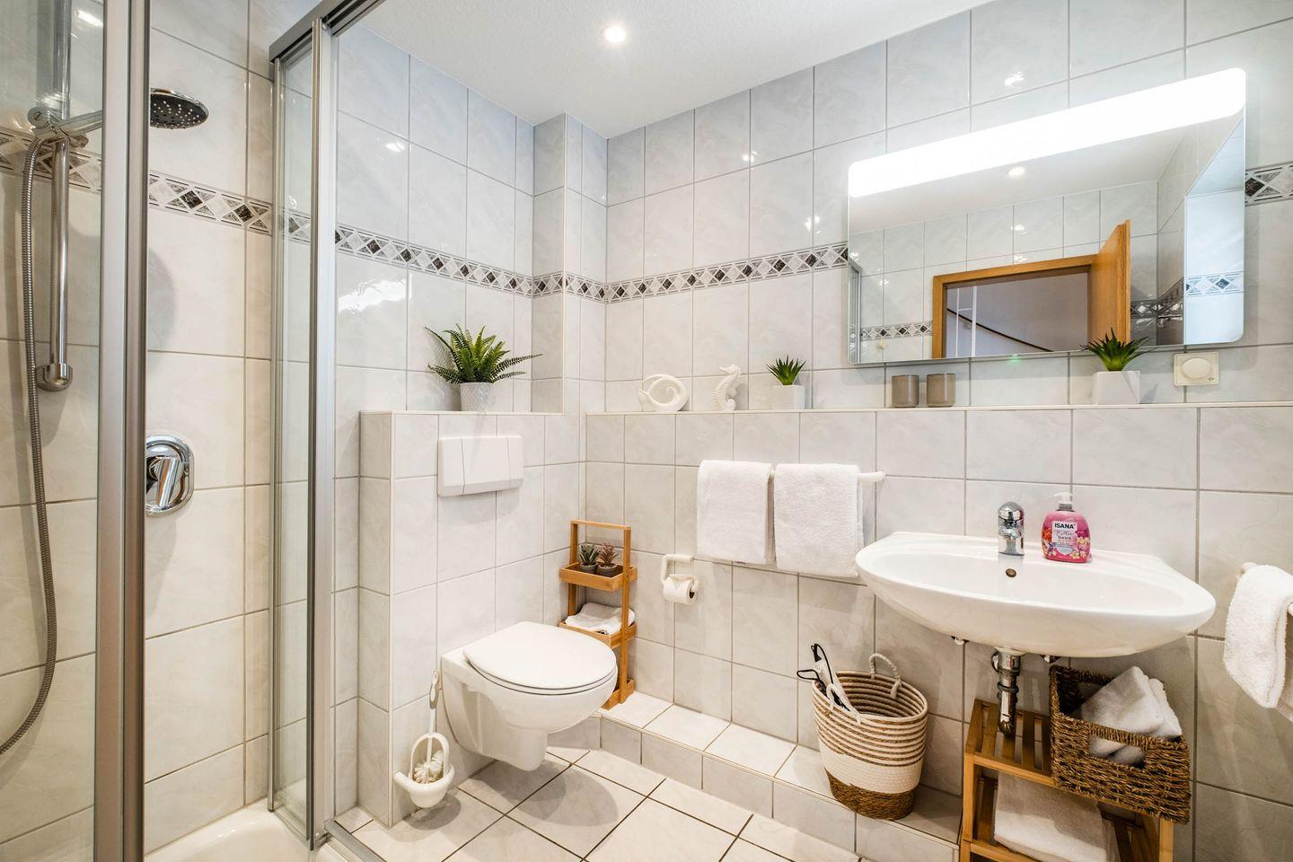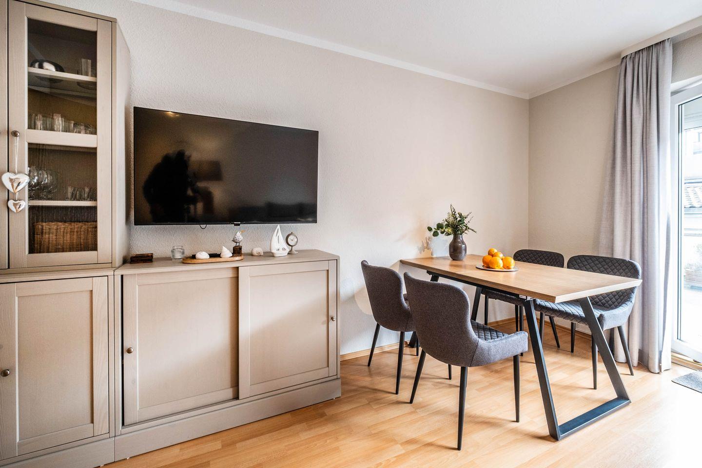 Haus Seemeile Wohnung 2.16 in Büsum bietet auf 60 m² Platz für bis zu vier Gäste in zwei Schlafzimmern. Die allergikergeeignete, modern ausgestattete Unterkunft verfügt über einen Balkon, eine offene Küche mit Spülmaschine, WLAN, zwei TVs sowie ein Badezimmer und ein Gäste-WC. Ein Aufzug, Privatparkplatz und kurze Wege zum Strand, Einkaufsmöglichkeiten und Restaurants sorgen für Komfort.